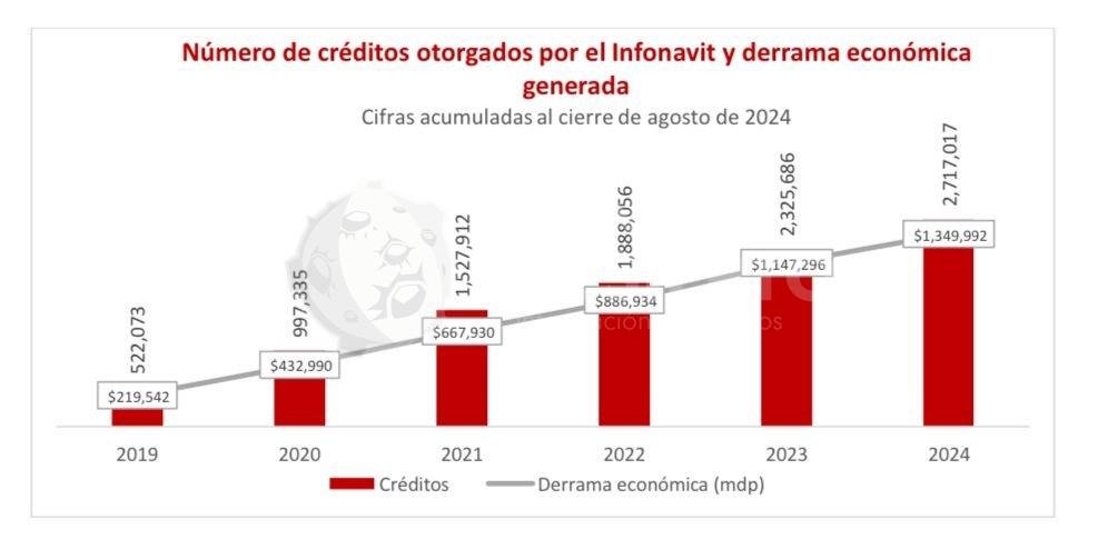 De 2019 al cierre de agosto de 2024, el Instituto del Fondo Nacional de la Vivienda para los Trabajadores (Infonavit) otorgó 2 millones 717 mil 017 créditos para la compra de vivienda, adquisición de terreno, mejoras o reparaciones en el hogar, construcción y pago de pasivos. Las cifras incluyen los créditos originados a partir de los desastres naturales ocurridos durante el sexenio.