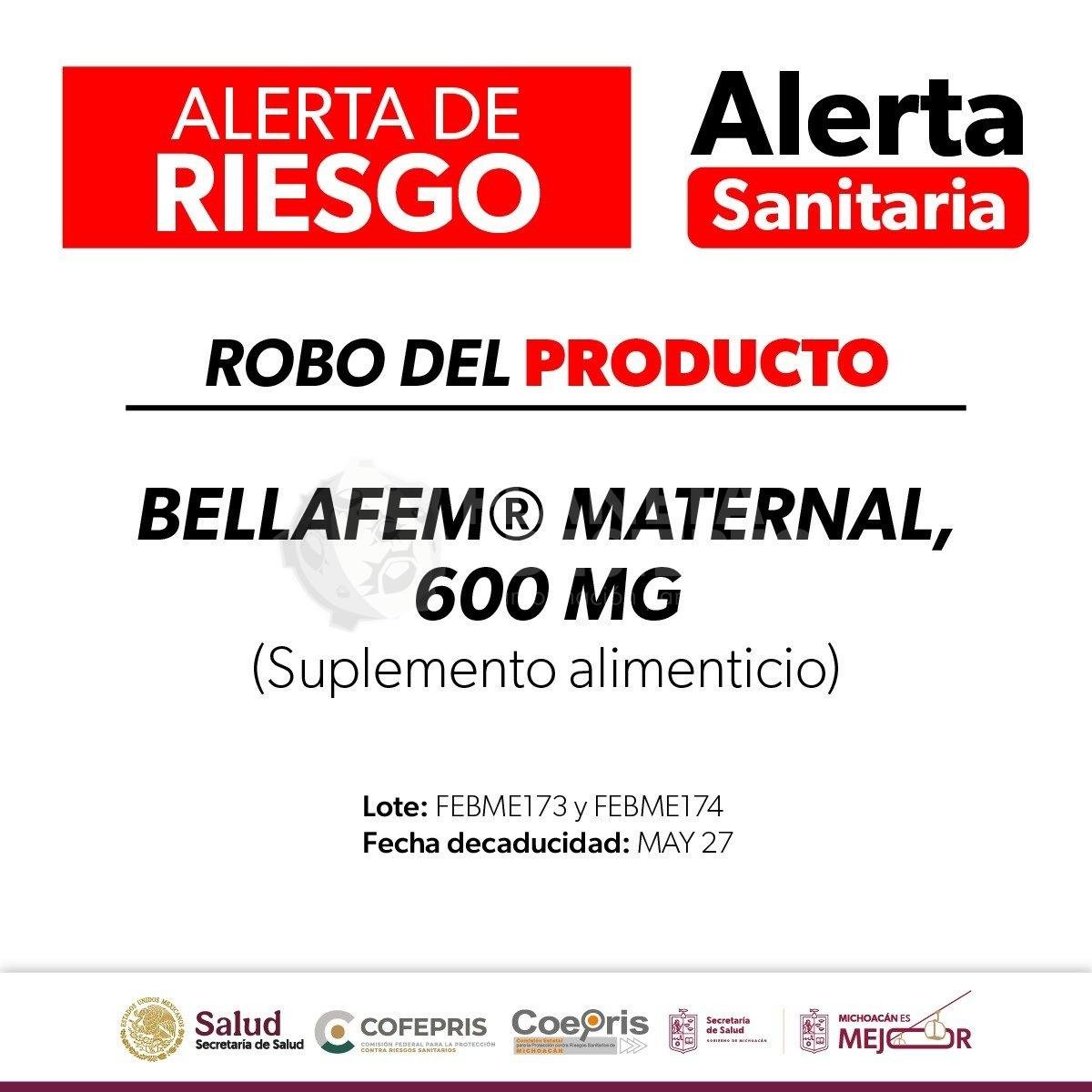 Morelia, Michoacán, 27 de enero de 2026.- La Comisión Federal para la Protección contra Riesgos Sanitarios (Cofepris), a través de la Secretaría de Salud de Michoacán (SSM), informa a la población sobre la alerta sanitaria emitida por el robo del producto Bellafem®️ maternal, suplemento alimenticio de 600 mg, lo que representa un riesgo potencial para la salud.