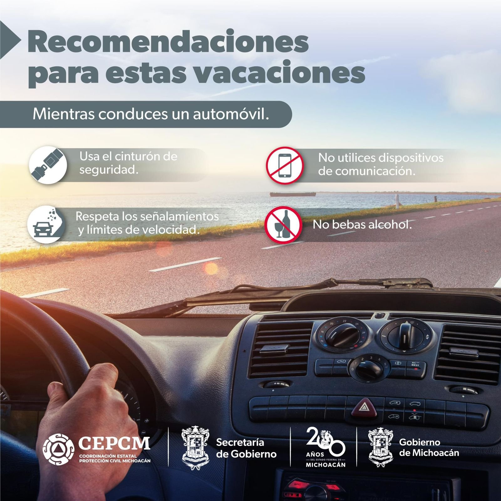 Morelia, Michoacán, 28 de marzo 2024.- La Secretaría de Gobierno (Segob), a través de la Coordinación Estatal de Protección Civil, exhorta a la población a mantener medidas preventivas antes de salir de vacaciones.