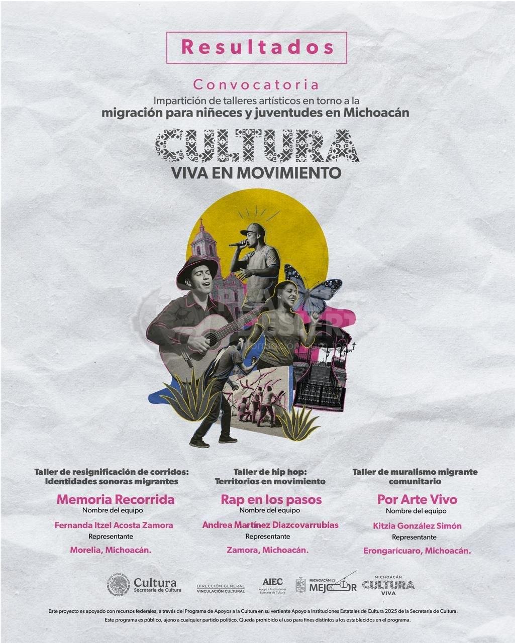 Los proyectos seleccionados fueron: “Memoria Recorrida”, de Fernanda Itzel Zamora, de Morelia, para el taller Resignificación de corridos: Identidades sonoras migrantes; “Rap en los pasos”, de Andrea Martínez Diazcovarrubias, de Zamora, para el taller Hip Hop: Territorios en movimiento; y “Por arte vivo”, de Kitzia González Simón, de Erongarícuaro, para el taller Muralismo comunitario migrante.