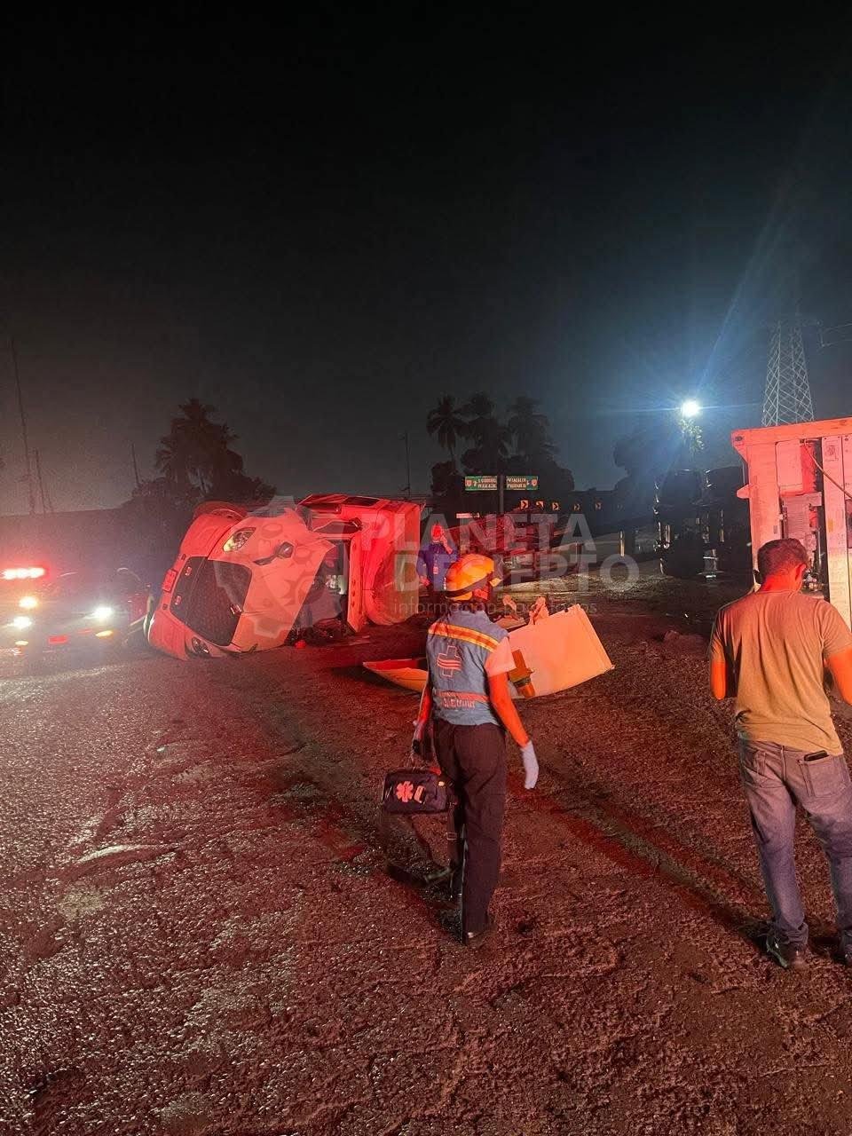 La unidad siniestrada corresponde a un tractocamión International de color blanco, con placas 96-BB-4R, el cual terminó volcado y bloqueando la vialidad.