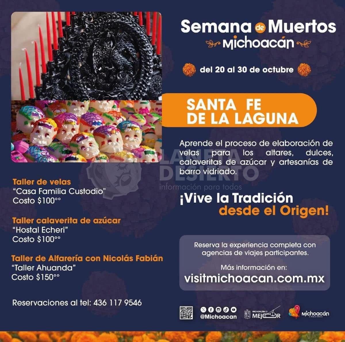 Por ello, la Secretaría de Turismo de Michoacán (Sectur), encabezada por Roberto Monroy García, recordó que en la localidad de Santa Fe de la Laguna, municipio de Quiroga, turistas y visitantes pueden aprender el proceso de elaboración de velas para los altares, calaveritas de azúcar y artesanías de barro vidriado.
