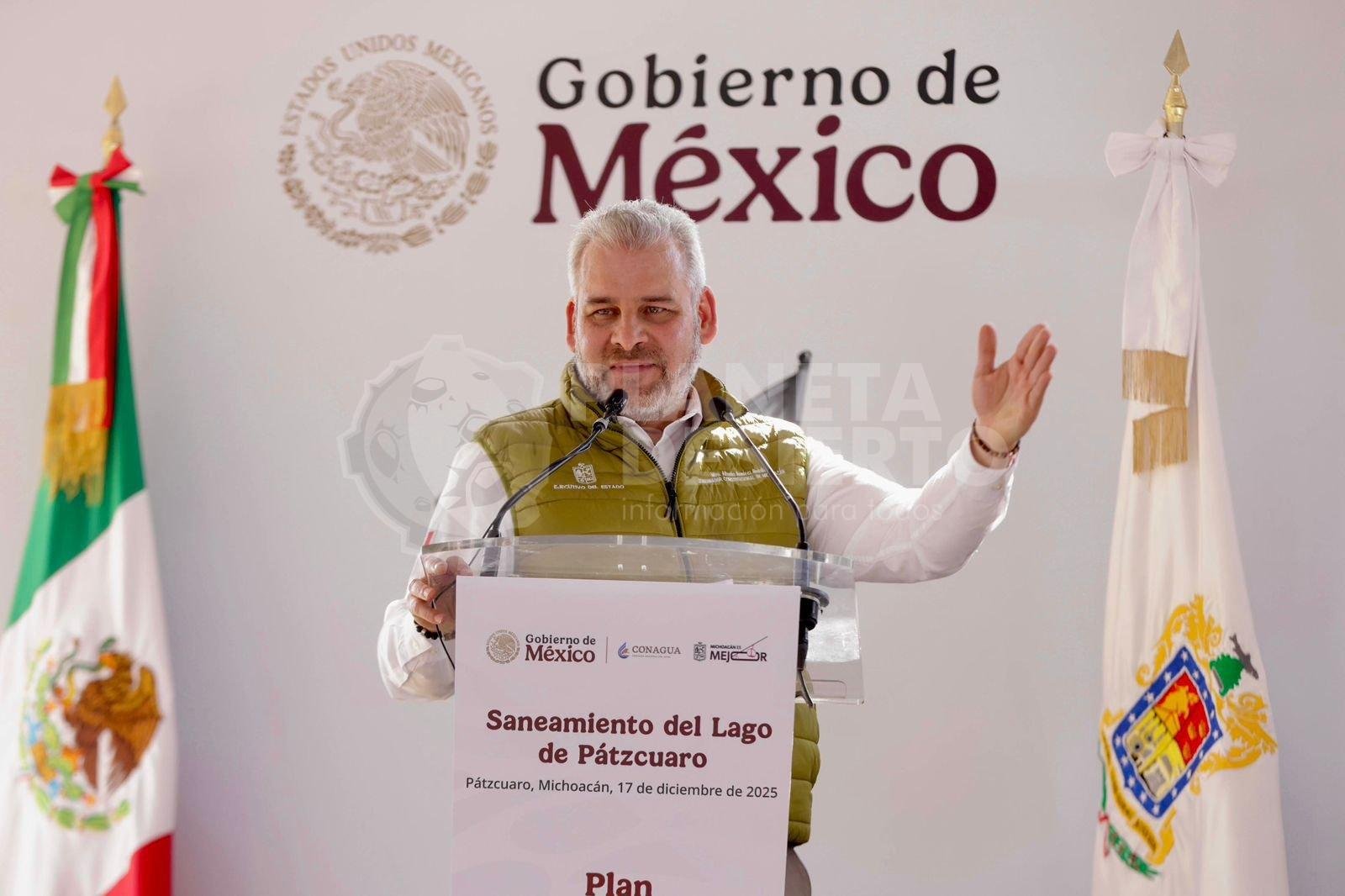 Pátzcuaro, Michoacán, 17 de diciembre de 2025.- Con una inversión federal histórica de 147 millones de pesos, el gobernador Alfredo Ramírez Bedolla y el coordinador del Plan General Lázaro Cárdenas de la Comisión Nacional del Agua (Conagua), Jorge Joaquín González Bezares, arrancaron los trabajos de rehabilitación de las plantas tratadoras de agua de San Pedrito, Las Garzas y Janitzio, para el saneamiento del lago de Pátzcuaro.