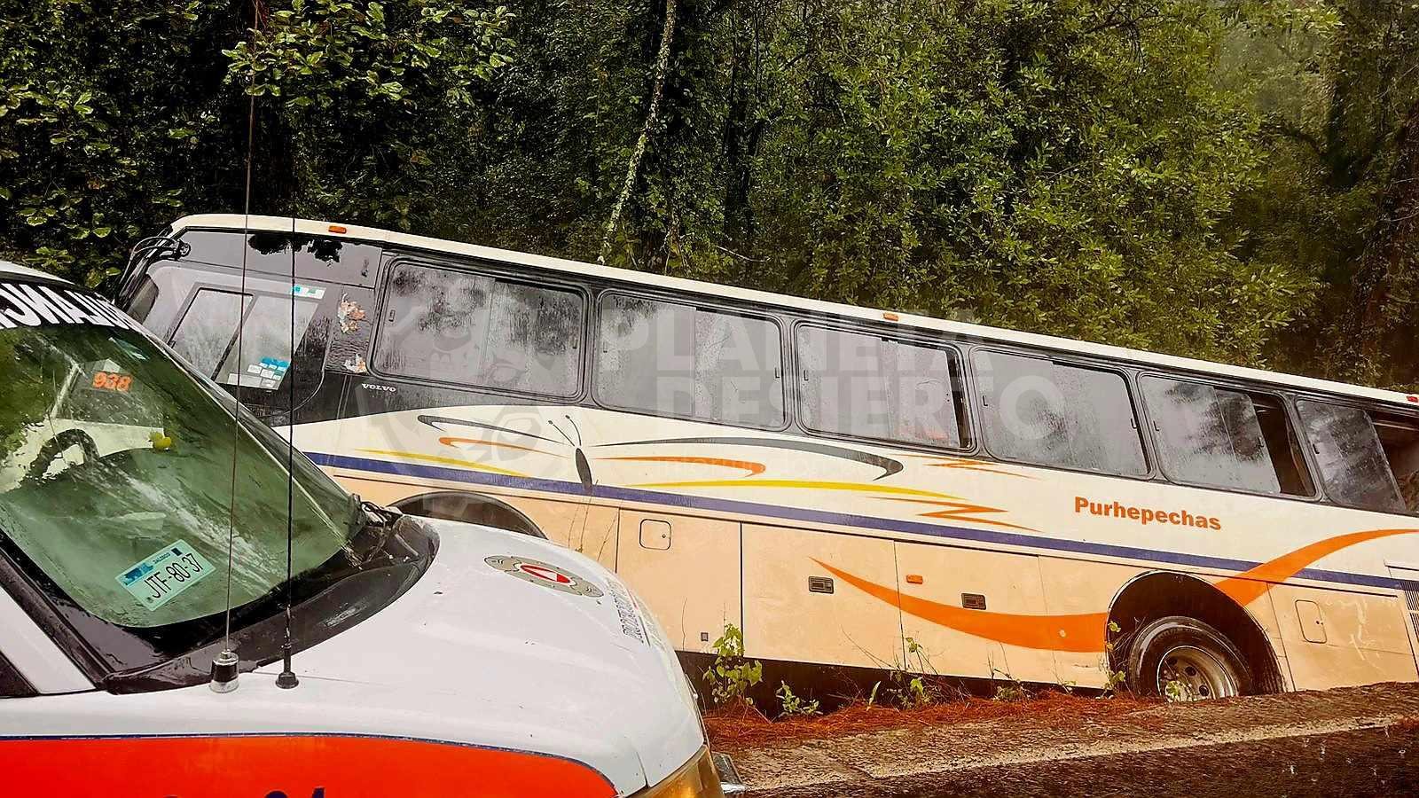 Fue cerca de las 13:00 horas de este jueves, cuando se reportó que un camión de la línea «Purepechas», a la altura del kilómetro 30, se salió de la cinta asfaltica y terminó dentro de un desnivel.