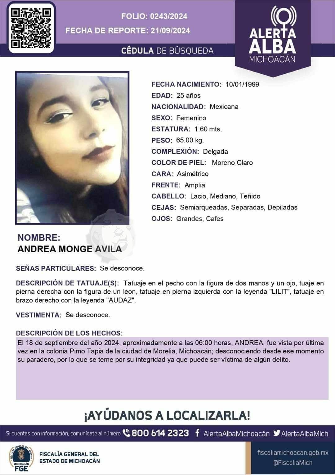 Morelia, Mich.- 23 de septiembre de 2024.- Se solicita la ayuda de la ciudadanía para localizar a Andrea Monge Ávila, de 25 años de edad, quien fue vista por última vez el pasado 18 de septiembre en la colonia Primo Tapia, en Morelia.