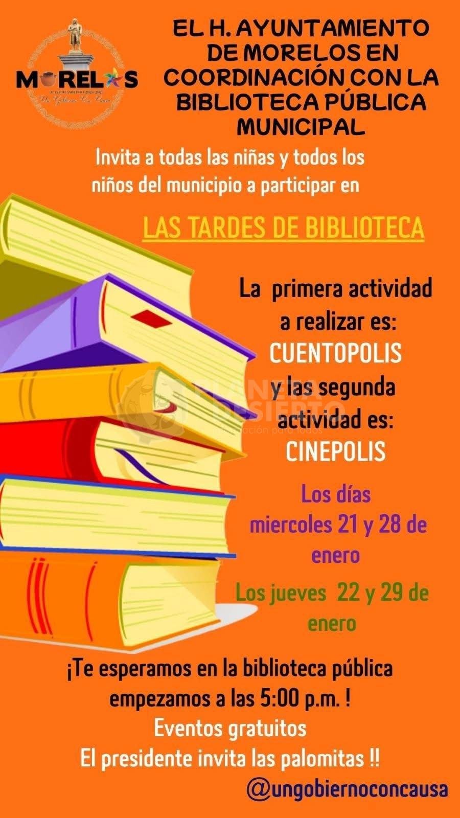 Con el objetivo de rescatar los espacios públicos y fomentar la cultura y el arte entre la niñez morelense, el Ayuntamiento de Morelos, en coordinación con los responsables de la Biblioteca Pública Municipal, convoca a niñas y niños del municipio a participar en el programa “Las Tardes de Biblioteca”, que se llevará a cabo en Villa Morelos.