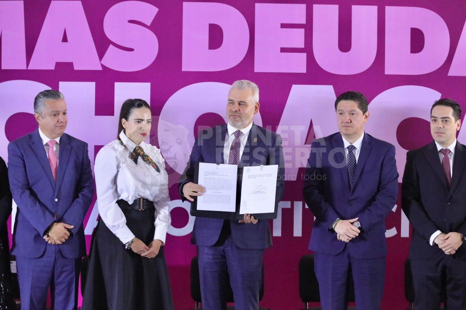 El mandatario firmó la propuesta, recibida por la diputada presidenta de la Mesa Directiva del Congreso local, Giulianna Bugarini Torres, que prohíbe a los Gobiernos estatales contratar deuda pública más allá del periodo constitucional para el que fueron electos, para no comprometer el futuro de los michoacanos.