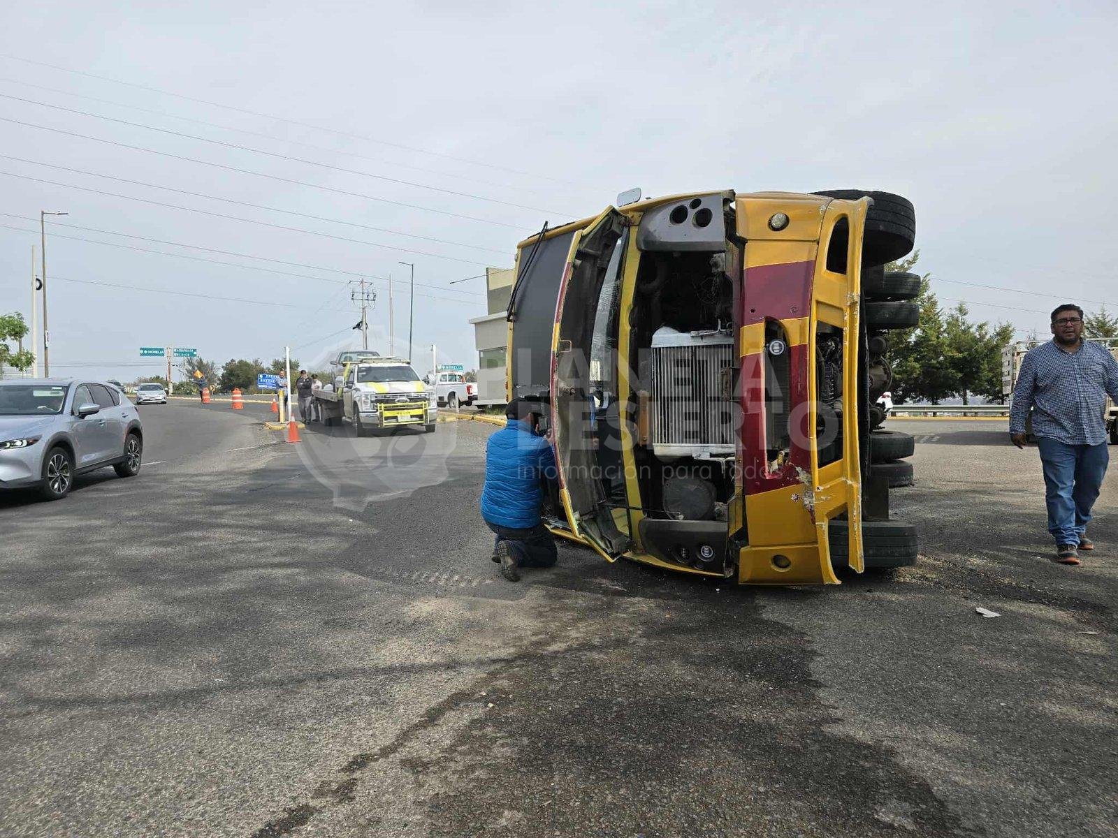 Camión Ruta Industrial vuelca tras chocar contra glorieta en Tres Marías; hay varios heridos
