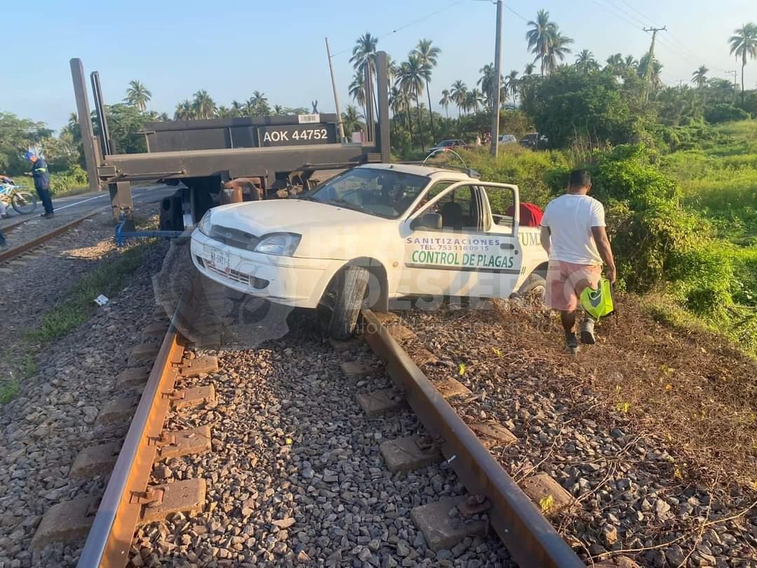 Lázaro Cárdenas, Mich.- 07 de febrero de 2024.- La conductora de una camioneta perteneciente a una empresa fumigadora, resultó ilesa luego de que fuera impactada por el ferrocarril, en esta demarcación de Lázaro Cárdenas.