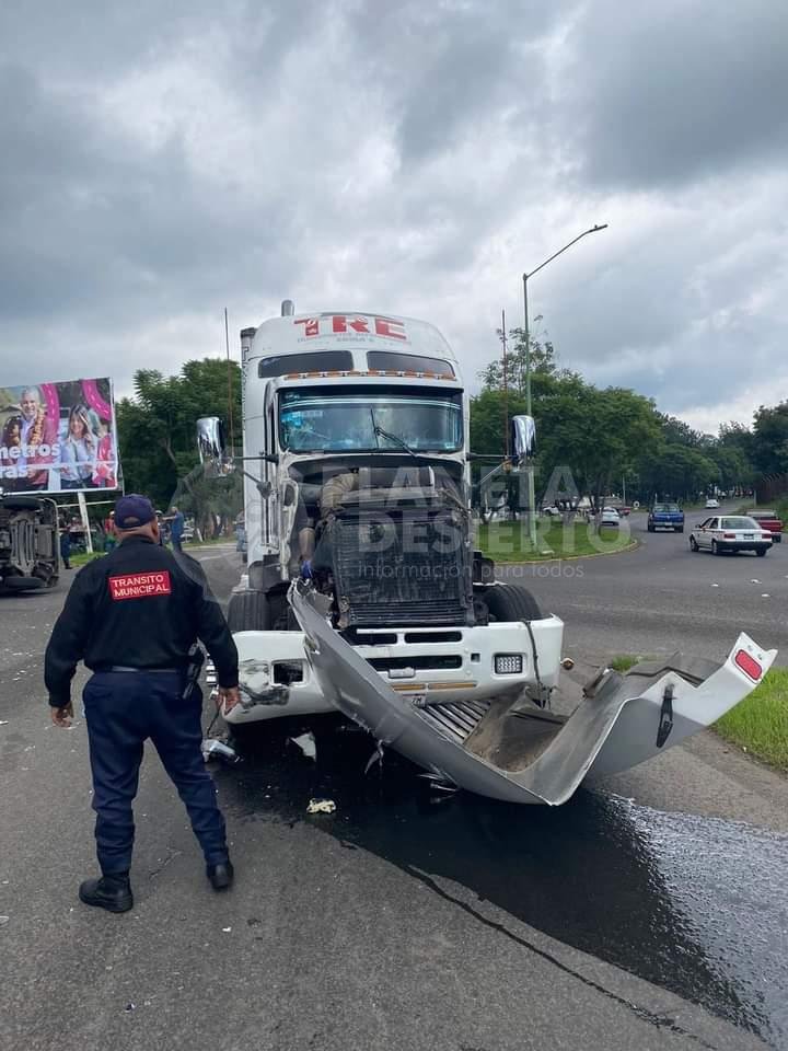 Uruapan, Mich.- 19 de septiembre de 2023.- Una aparatosa carambola vehicular en la que estuvieron involucrados un tráiler, un camión del servicio público y una camioneta de carga, dejó como saldo cuantiosos daños materiales, en el entronque de La Cofradía.