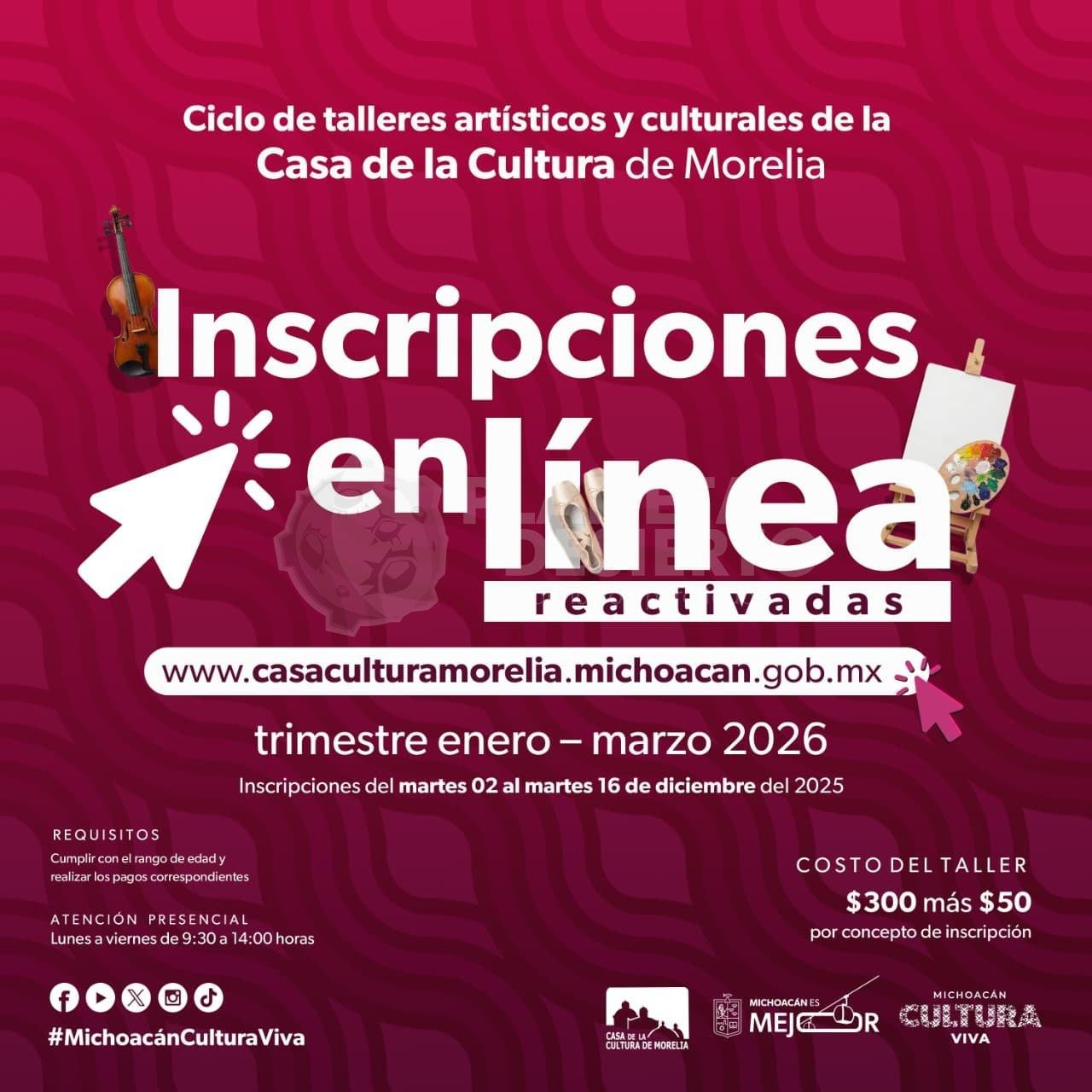 Morelia, Michoacán, 5 de diciembre de 2025.- La Secretaría de Cultura de Michoacán (Secum) anuncia la reactivación de la plataforma digital de inscripciones para los talleres del primer trimestre de 2026 en la Casa de la Cultura de Morelia, con una oferta formativa diversa para todas las edades. El trámite se podrá realizar hasta el 16 de diciembre.