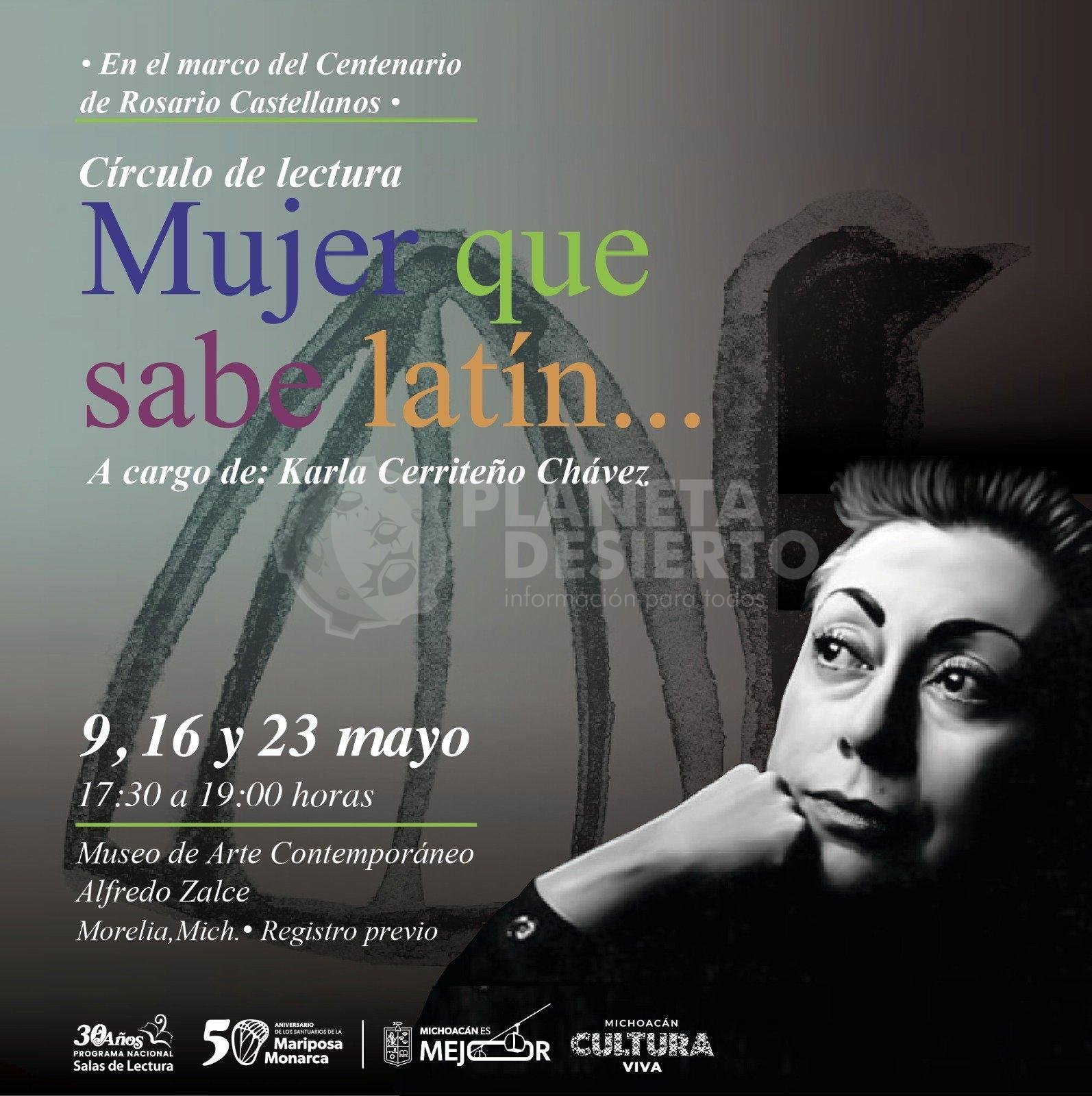 Morelia, Michoacán, 28 de abril de 2025.- En el marco del centenario del natalicio de Rosario Castellanos Figueroa, la Secretaría de Cultura de Michoacán, en coordinación con el Programa Nacional Salas de Lectura, invita a participar en el círculo de lectura “Mujer que sabe latín….” Las sesiones se realizarán en el Museo de Arte Contemporáneo Alfredo Zalce (MACAZ) los días 9, 16 y 23 de mayo, a las 17:30 horas.