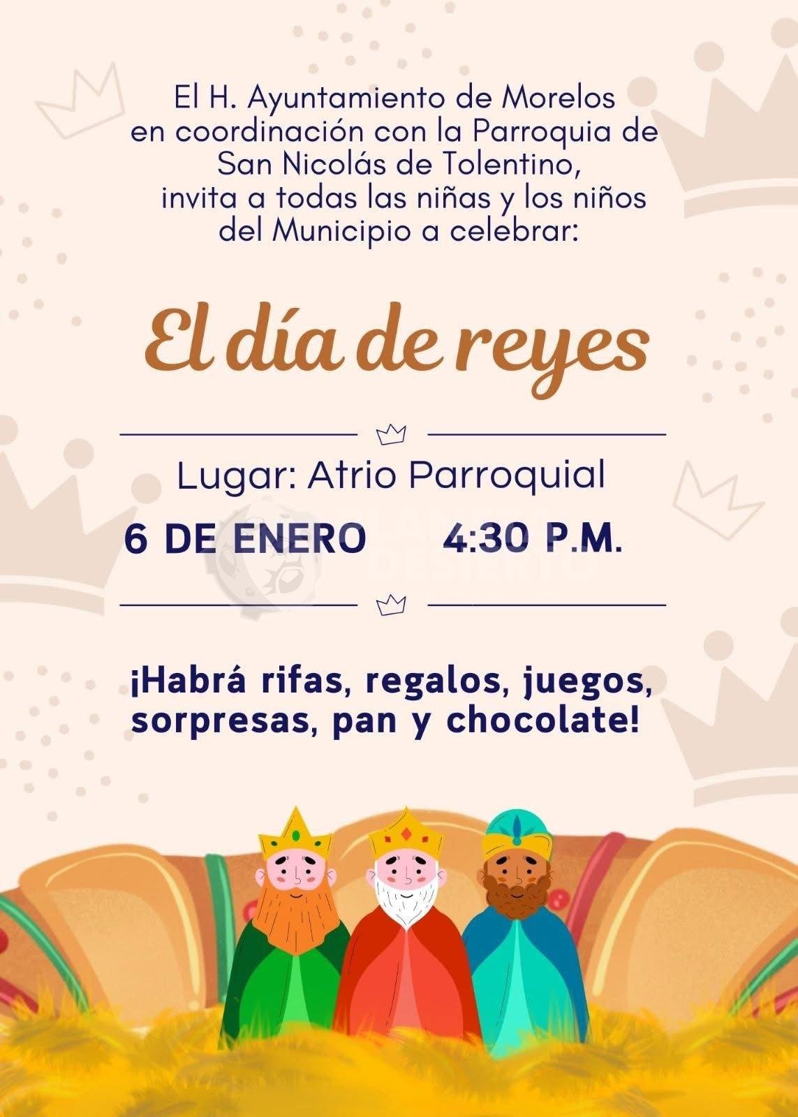 Villa Morelos, Michoacán, a 5 de enero 2026.– El Ayuntamiento de Morelos, en coordinación con la Parroquia de San Nicolás de Tolentino, invita a todas las niñas y los niños del municipio a celebrar el tradicional Día de Reyes, una festividad que forma parte del arraigo cultural y religioso de la comunidad.