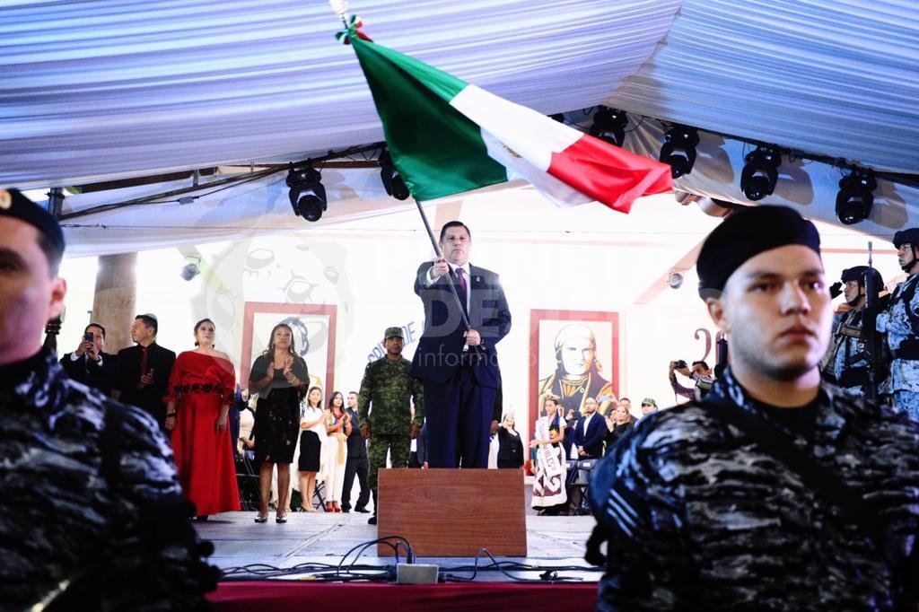 Sosteniendo la Bandera Nacional, Nacho Campos, vitoreó a los héroes que entregaron su vida por la patria, Miguel Hidalgo, José María Morelos, Josefa Ortiz de Domínguez, Vicente Guerrero e Ignacio Allende, para culminar su arenga con, ¡que viva Michoacán!, ¡que viva Uruapan!, ¡que viva la transformación de Uruapan!, ¡Qué viva México!