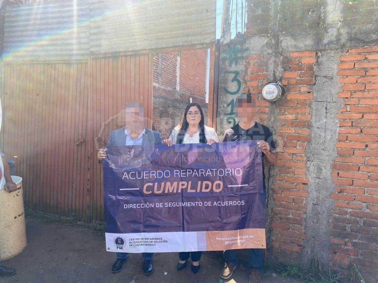 Uruapan, Mich.- 10 de noviembre de 2025.- La Fiscalía General del Estado de Michoacán (FGE), a través del Centro de Mecanismos Alternativos de Solución de Controversias (CMASC), logró la celebración de un acuerdo reparatorio que permitió la restitución de un inmueble a su legítima propietaria, víctima de despojo en Uruapan.