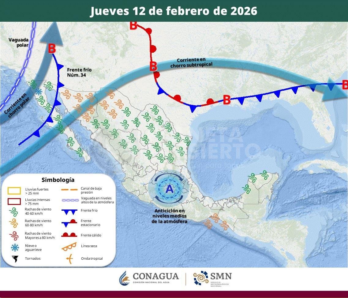 Para este jueves, el desplazamiento del Frente Frío número 34 y una vaguada polar sobre el noroeste del territorio nacional, en interacción con las corrientes en chorro polar y subtropical, generarán un descenso térmico considerable, vientos fuertes y potencial de caída de nieve o aguanieve. Ante estas condiciones, la Coordinación Nacional de Protección Civil (CNPC), de la Secretaria de Seguridad y Protección Ciudadana (SSPC), emite las siguientes recomendaciones proactivas para salvaguardar la integridad de la población en dichas zonas.