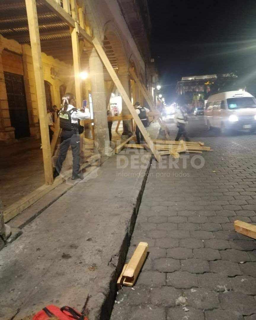 Morelia, Mich.- La noche de ayer miércoles colapsaron unas vigas que estaban colocadas en los portales de la calle Allende, en el Centro Histórico de Morelia. Los citados objetos, al caer, alcanzaron a impactar un auto ocupado por cinco personas, las cuales por fortuna resultaron ilesas.