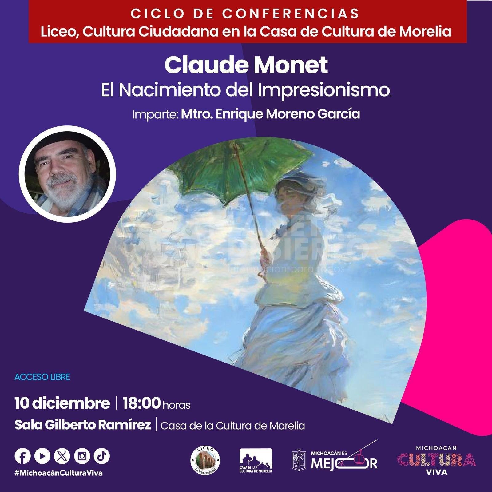 Morelia, Michoacán, 9 de diciembre de 2025.- El color y la revolución artística del siglo XIX tienen una cita especial en la Casa de la Cultura de Morelia este 10 de diciembre a las 18:00 horas, con la conferencia gratuita “Claude Monet. El nacimiento del Impresionismo”, que se realiza como parte del ciclo “Liceo, Cultura Ciudadana en la Casa de la Cultura de Morelia”, informa la Secretaría de Cultura de Michoacán (Secum).