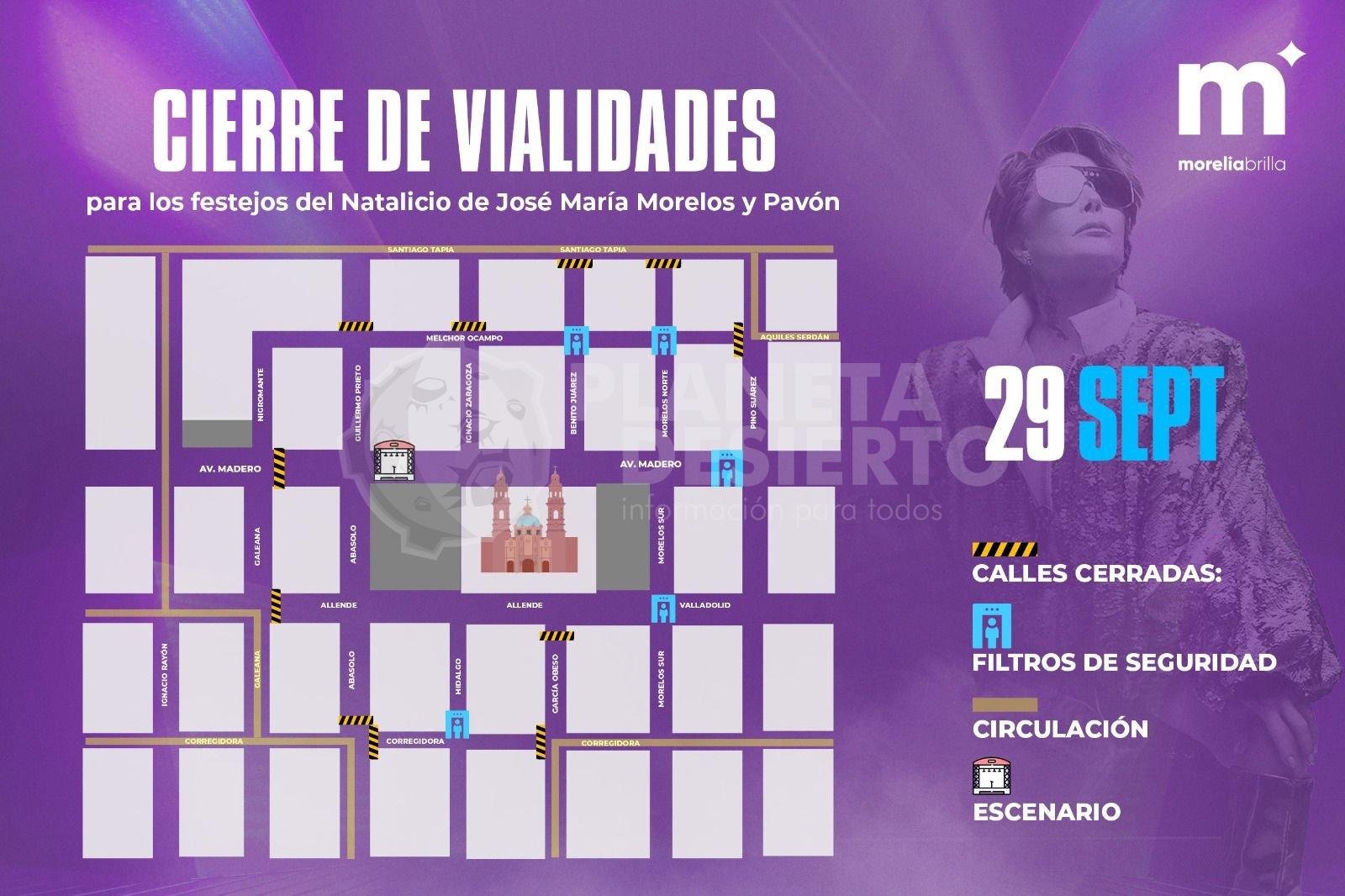 Morelia, Michoacán; 28 de septiembre de 2024.- El Gobierno de Morelia informa los cierres viales que se realizarán este 29 de septiembre en el centro histórico de la ciudad, con motivo del concierto por la celebración del 259 aniversario del natalicio del Generalísimo José María Morelos y Pavón.