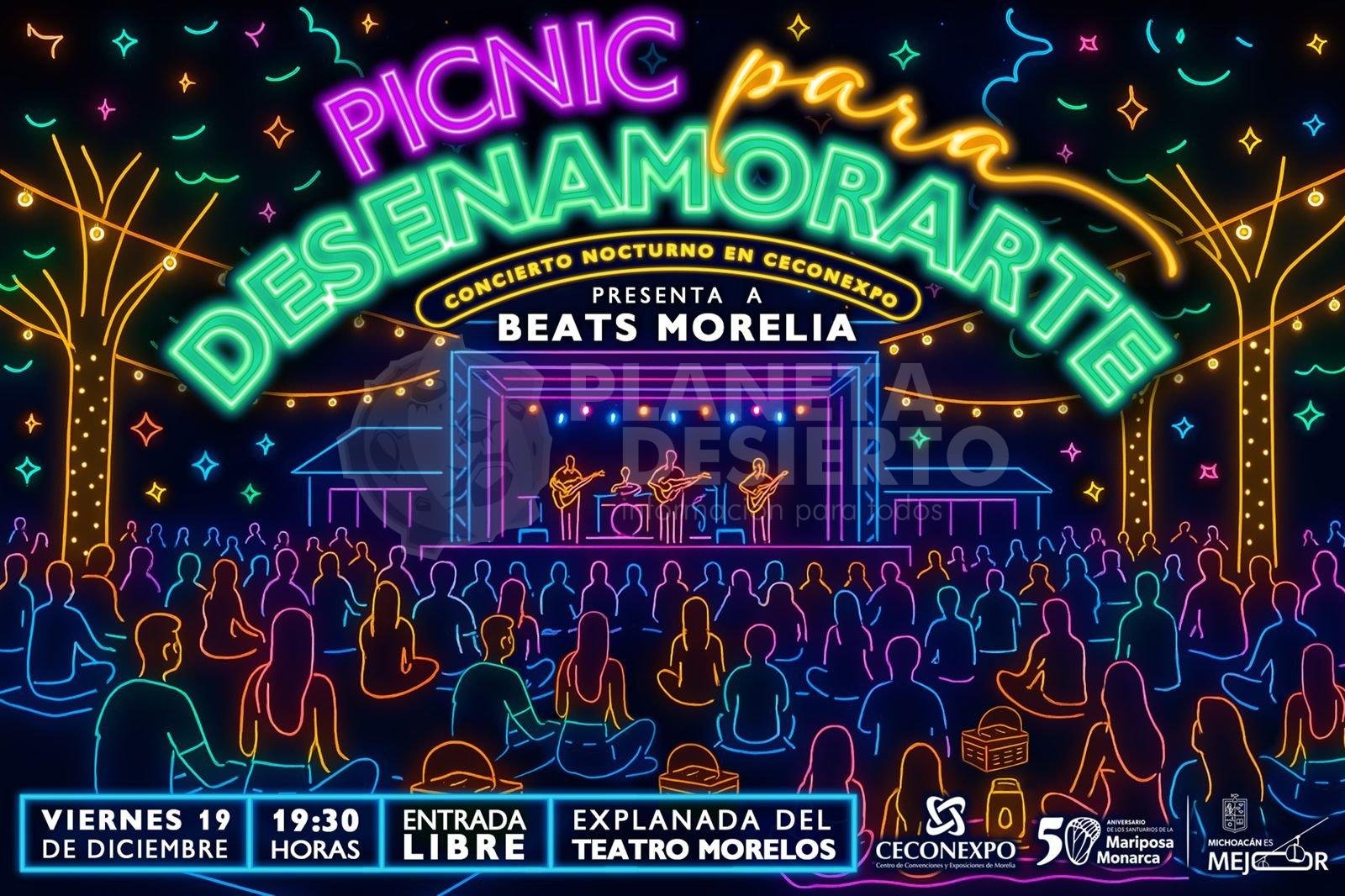 Morelia, Michoacán, 12 de diciembre del 2025.- El Centro de Convenciones y Exposiciones de Morelia (Ceconexpo) invita al «Picnic para Desenamorarte». Un evento temático diseñado para que el público disfrute de una noche con la banda Beats Morelia, la cual se encargará de ambientar la noche, poniendo a todos a cantar a todo pulmón y a bailar para liberar las penas.