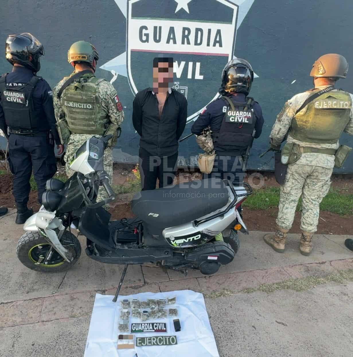 Al patrullar sobre una brecha de terracería en la colonia Villas del Oriente, elementos de la Guardia Civil y del Ejército Mexicano localizaron al ahora detenido de 26 años a bordo de una motocicleta, a quien le marcaron el alto para efectuarle una inspección.