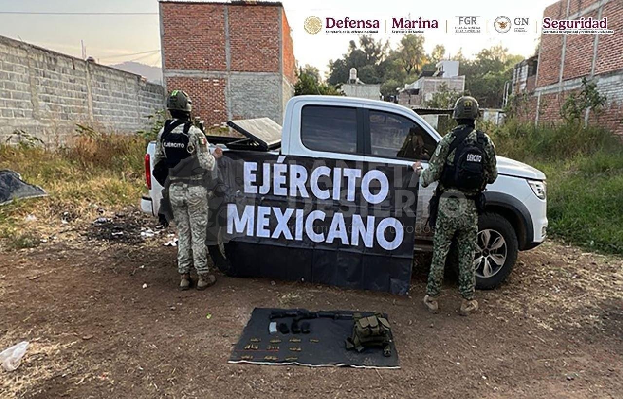 Resultado de las labores del Plan Michoacán por la Paz y la Justicia, elementos de la Secretaría de la Defensa Nacional (Defensa) y Guardia Nacional (GN), en coordinación con la Secretaría de Marina (Semar), Fiscalía General de la República (FGR) y Secretaría de Seguridad y Protección Ciudadana (SSPC), junto con autoridades locales, se detuvo a cinco personas, se aseguró un arma de fuego, 98 cartuchos, cuatro cargadores, dos artefactos explosivos improvisados y cuatro vehículos.