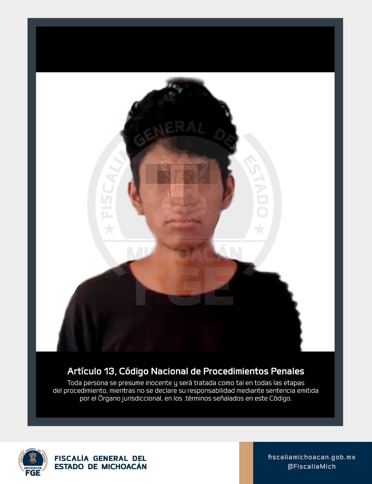 Jacona, Michoacán, a 1 de abril de 2024.- Personal de la Fiscalía General del Estado de Michoacán (FGE) detuvo a José Guadalupe “N”, por su posible relación en los delitos de homicidio calificado, homicidio calificado de persona menor de edad y privación ilegal de la libertad; hechos ocurridos en un centro de rehabilitación de Jacona, en agravio de tres hombres y un adolescente.
