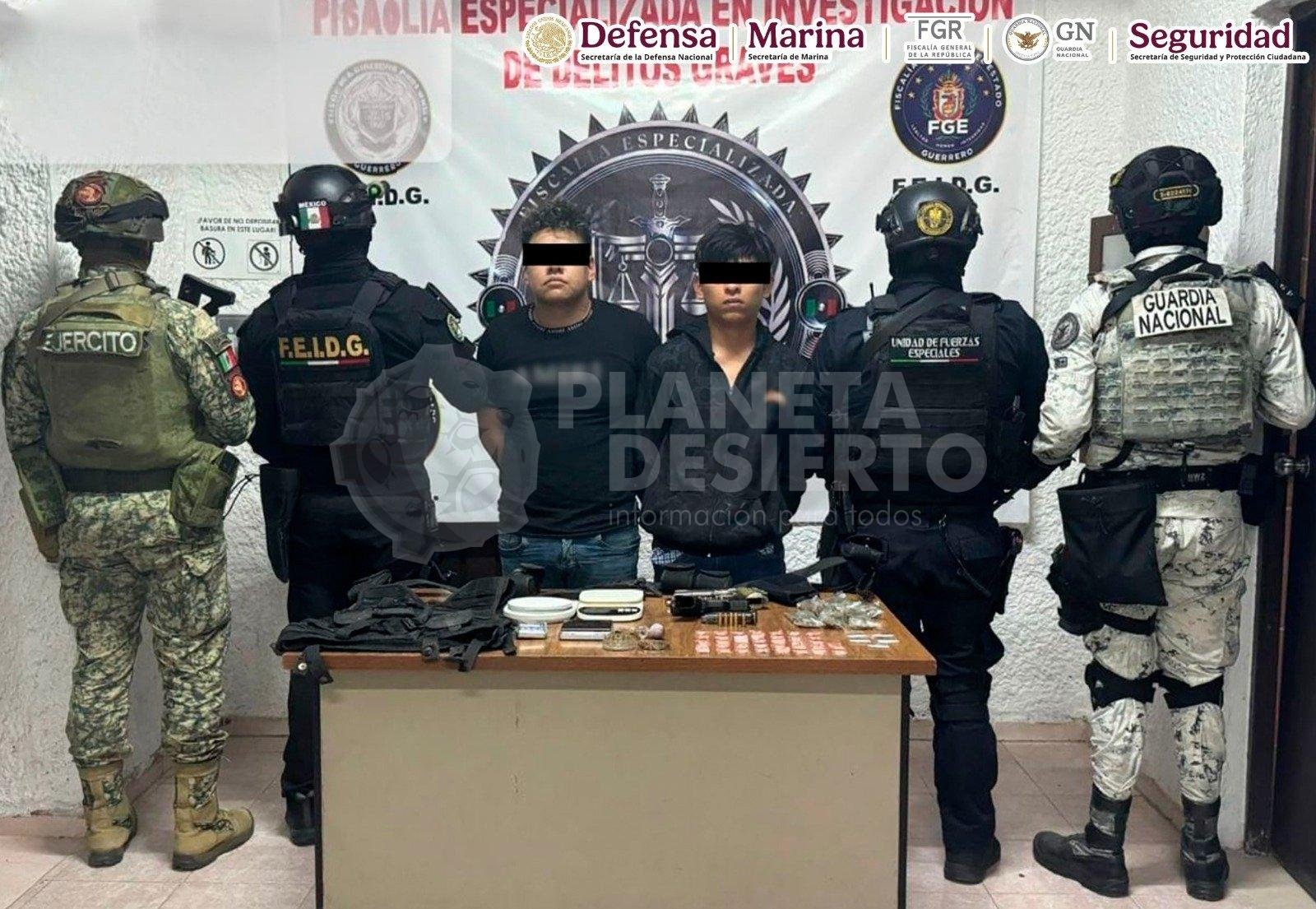 En seguimiento a trabajos de inteligencia e investigación en Guerrero, elementos de la Secretaría de la Defensa Nacional (Defensa), Secretaría de Marina (Semar), Fiscalía General de la República (FGR), Guardia Nacional (GN), Secretaría de Seguridad y Protección Ciudadana (SSPC), en coordinación con la Fiscalía General del Estado y la Secretaría de Seguridad Pública, ambas del estado, ejecutaron una orden de cateo donde detuvieron a dos personas, aseguraron armas de fuego y dosis de drogas.