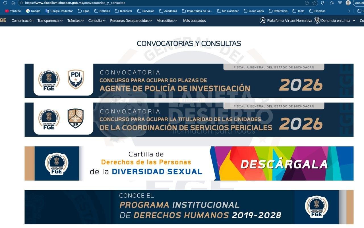 Morelia, Michoacán, a 5 de enero de 2026.- La Fiscalía General del Estado de Michoacán (FGE) emitió convocatoria interna para ocupar la titularidad de las Unidades de Criminalística, Química y Genética; Medicina Forense; Preservación y Manejo de Evidencias; Servicios Periciales y Escena del Crimen; así como de las Unidades de Servicios Periciales de las Fiscalías Regionales de Uruapan, Zamora, Zitácuaro, Apatzingán, La Piedad, Jiquilpan, Lázaro Cárdenas, Huetamo y Coalcomán. También se emitió una convocatoria externa para la cobertura de 50 plazas de agente de la Policía de Investigación, con el objetivo de fortalecer la capacidad operativa y técnica de la institución.