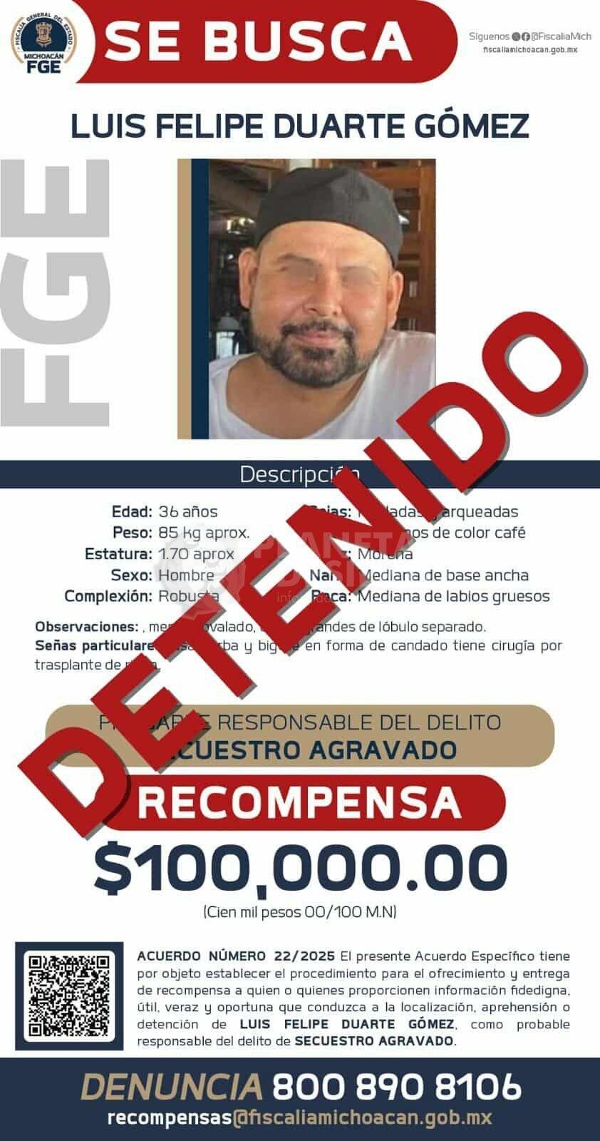 Morelia, Mich.- 11 de diciembre de 2025.- Resultado de un trabajo interinstitucional en el que participaron a Fiscalía General del Estado de Michoacán (FGE), Fiscalía General de Justicia de Nuevo León, y la Secretaría de Seguridad Pública de Michoacán (SSP) fue detenido en esa entidad Luis Felipe “N”, por su presunta participación en el delito de secuestro agravado, perpetrado el pasado 24 de noviembre en agravio de Maritza E. y sus dos hijas menores de edad, en la ciudad de Uruapan.