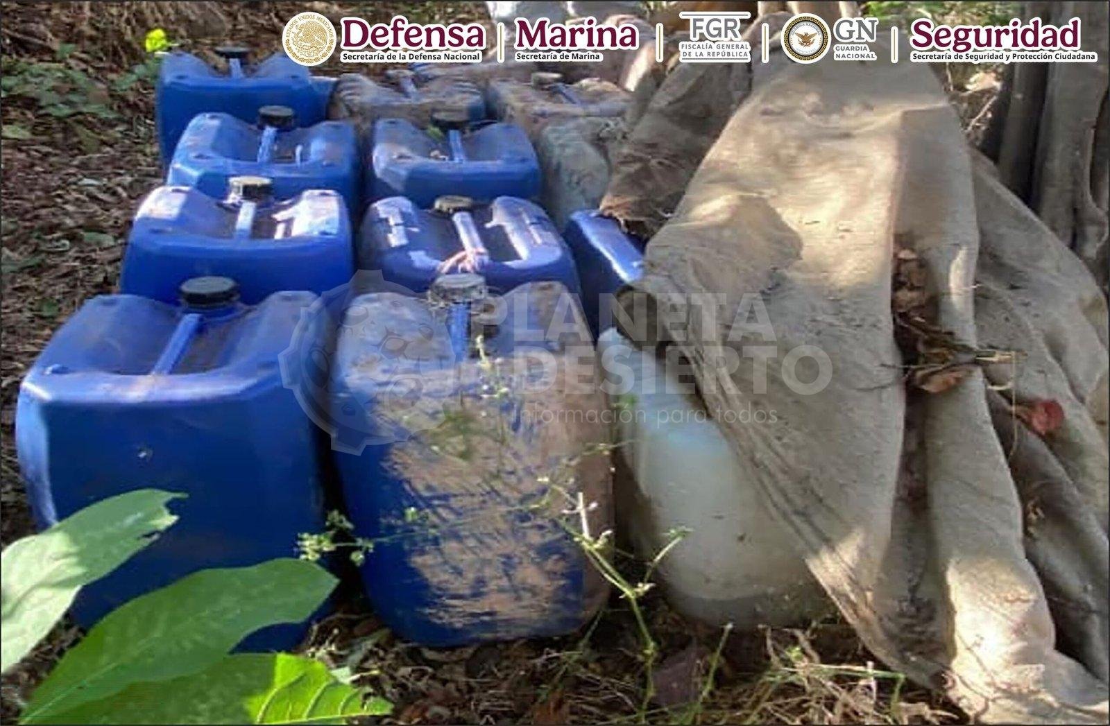 También, en Culiacán, en los poblados Los Sabinitos, Lo de Tomás y El Platanar, al efectuar recorridos de reconocimiento se localizaron e inhabilitaron cuatro áreas de concentración de material diverso para la elaboración de metanfetamina, donde se aseguraron 2,810 litros de sustancias químicas.