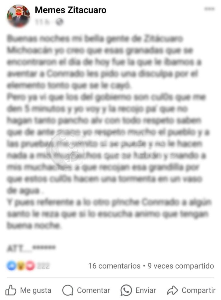 Zitácuaro, Mich.- 09 de febrero de 2024.- Luego de que el pasado jueves, fuera localizada una granada, en una cuneta de la carretera a Morelia cerca de La Palma de Cedano, delincuentes a través de redes sociales se asumieron como los responsables de que se les “cayera” dicho explosivo, poniendo en riesgo a la ciudadanía.