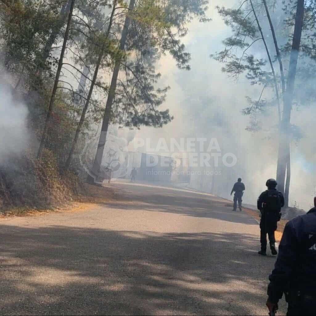 El intercambio de disparos se registró durante la tarde de este domingo en la citada ubicación. En el sitio quedaron dañados cuatro vehículos: una patrulla municipal —la cual presentaba al menos 55 impactos de proyectil—, así como un tractocamión con caja refrigerada totalmente calcinado, una camioneta y un camión incendiados.