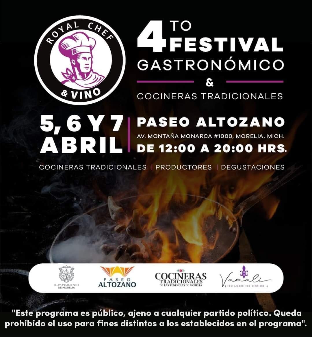 Morelia, Michoacán; 04 de abril del 2024.- Bajo la premisa de dar a conocer el sabor de la cocina local y nacional, este fin de semana (del 5 al 7 de abril) la Secretaría de Fomento Económico invita al 4° Festival Gastronómico “Royal, Chef y Vino”, evento que se desarrollará en las instalaciones del centro comercial Paseo Altozano y en donde participarán Cocineras y Cocineros Tradicionales de Morelia.