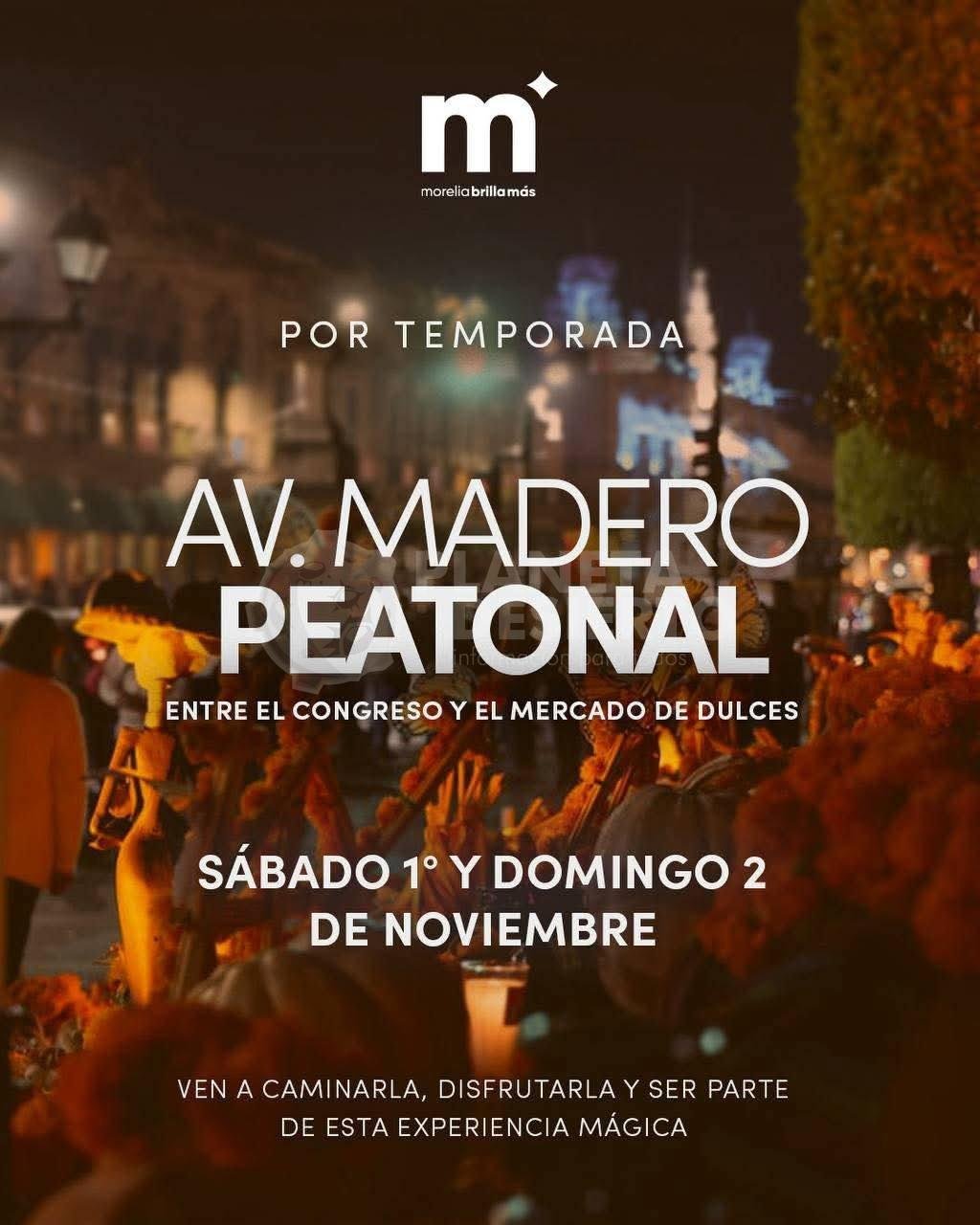 Durante el sábado y el domingo, la avenida Madero, desde la calle El Nigromante hasta Pino Suárez, estará cerrada al tránsito vehicular para que morelianos, morelianas, turistas y visitantes, caminen mayor seguridad y orden.