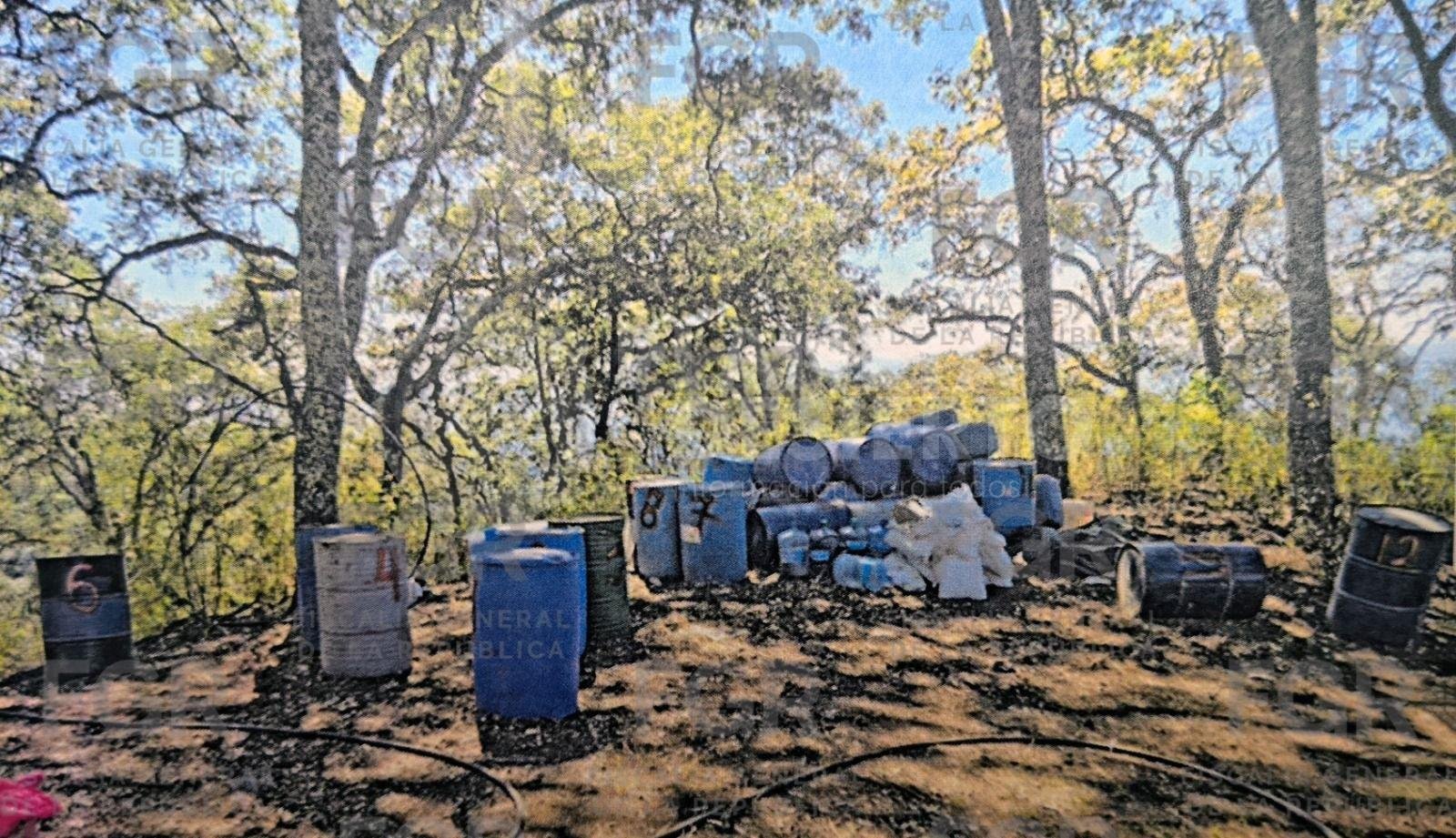 En la acción, coordinada por el Gabinete de Seguridad del Gobierno de México, por conducto de la Secretaría de la Defensa Nacional (Defensa), percibieron un olor a químicos, por lo que se acercaron a inspeccionar la zona; en el lugar, localizaron 15 tanques de gas, 45 recipientes de plástico de diferentes capacidades vacíos, 25 tambos vacíos, 72 bidones vacíos, dos hornos artesanales, un tinaco de mil 100 litros de capacidad vacío, 27 bidones de 20 litros con sustancia líquida y 13 costales de 25 kilos que contenían hidróxido de sodio.