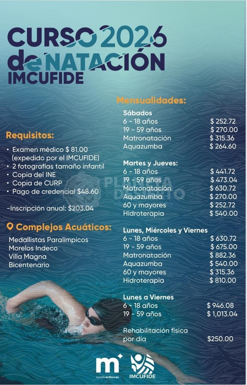 Morelia, Michoacán; 06 de enero de 2026.- El Gobierno de Morelia, a través de su Instituto Municipal de Cultura Física y Deporte (Imcufide), invita a la ciudadanía a inscribirse a los Cursos de Natación 2026, que iniciarán el 12 enero en las albercas Bicentenario, Villa Magna, Morelos-Indeco y «Medallistas Paralímpicos».