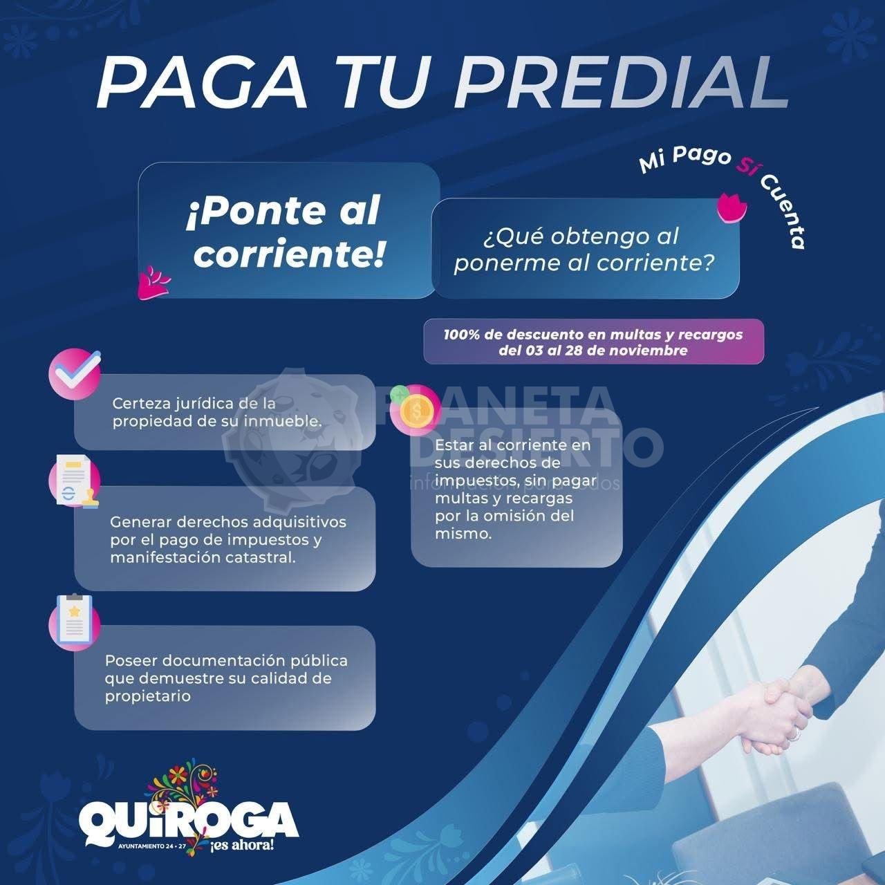 Quiroga, Michoacán, a 4 de noviembre 2025. – Con el propósito de apoyar la economía de las familias quiroguenses y al mismo tiempo fortalecer la recaudación municipal para seguir impulsando obras y programas de desarrollo, la presidenta municipal, Alma Mireya González Sánchez, anunció el inicio de una campaña especial de descuentos en el pago del impuesto predial.