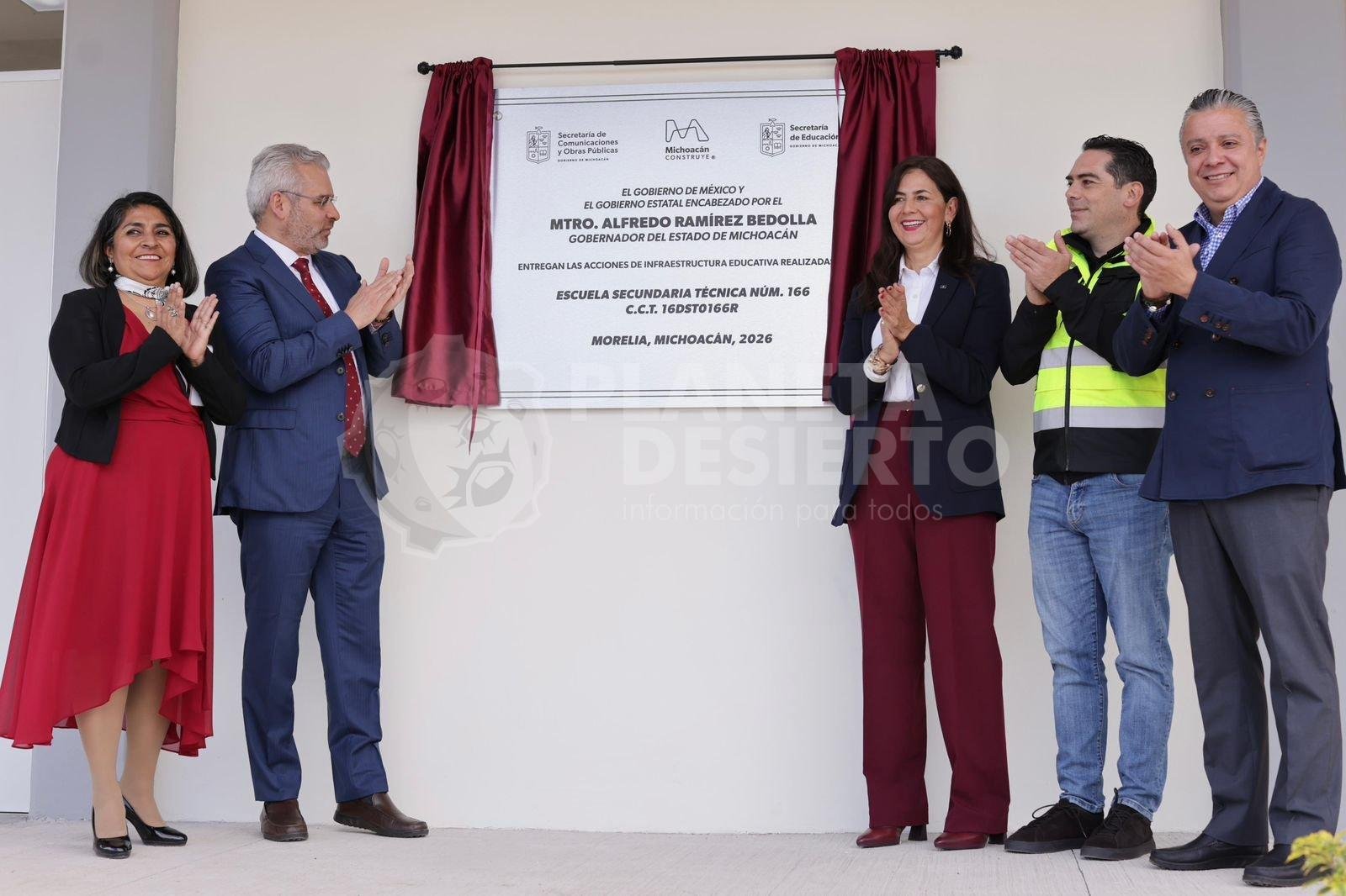 Morelia, Michoacán, 27 de enero de 2026.- El gobernador Alfredo Ramírez Bedolla inauguró las nuevas instalaciones de la Escuela Secundaria Técnica 166, obra en la que se invirtieron 12 millones de pesos para la construcción de un edificio con seis aulas, laboratorio, patio cívico, cancha de usos múltiples, entre otras amenidades.