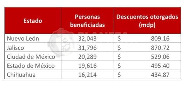– Nuevo León con 32,043 personas beneficiadas y $809.16 mdp en descuentos otorgados.