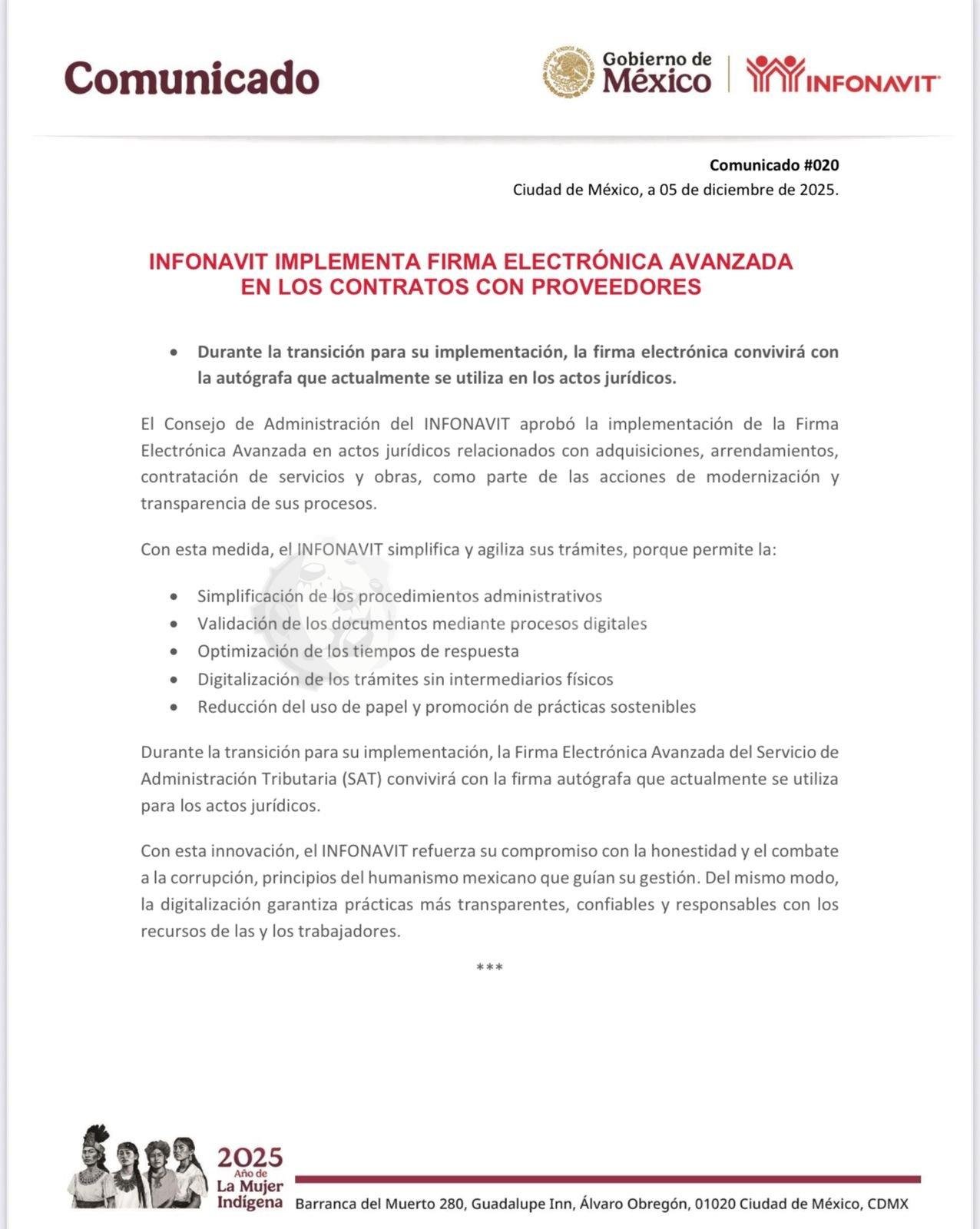 Con esta innovación, el INFONAVIT refuerza su compromiso con la honestidad y el combate a la corrupción, principios del humanismo mexicano que guían su gestión. Del mismo modo, la digitalización garantiza prácticas más transparentes, confiables y responsables con los