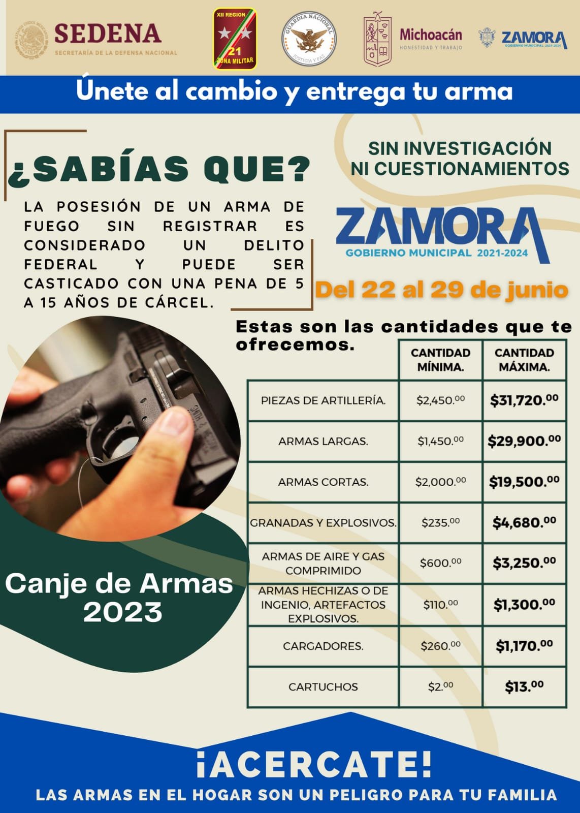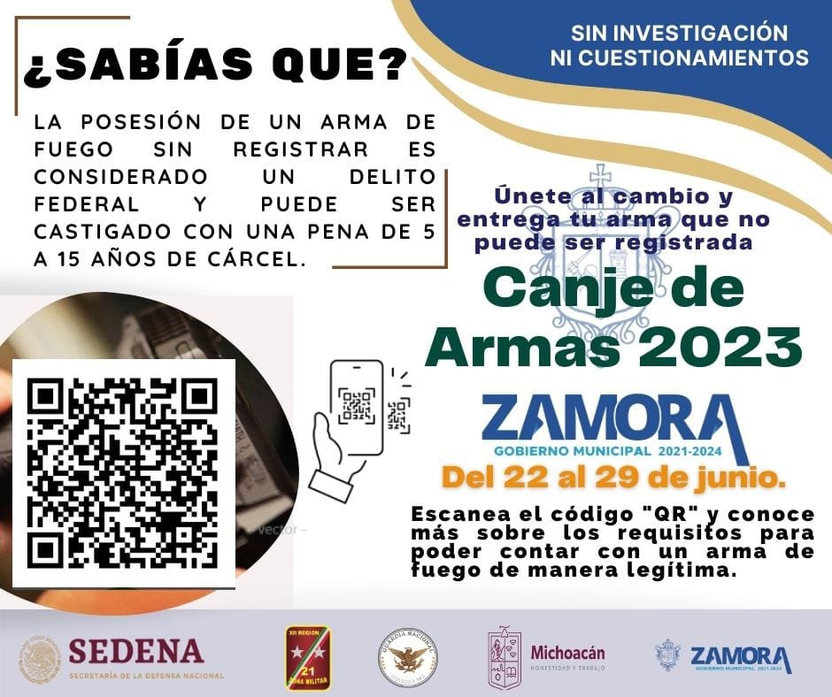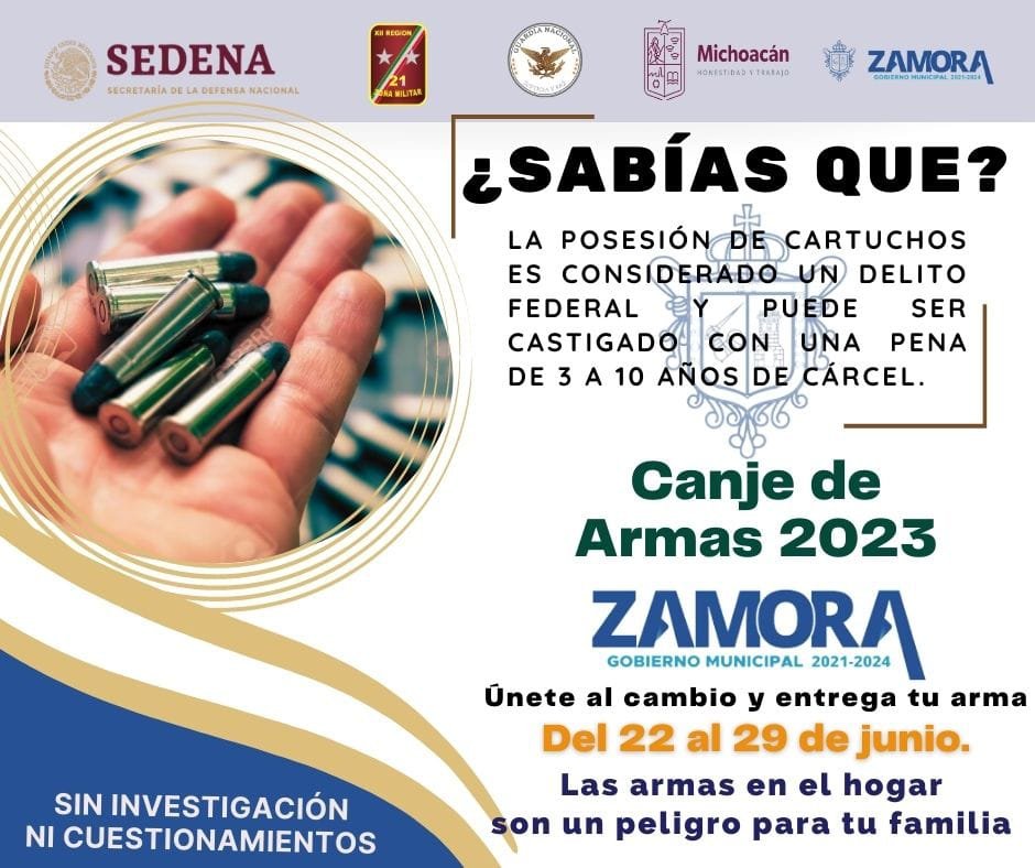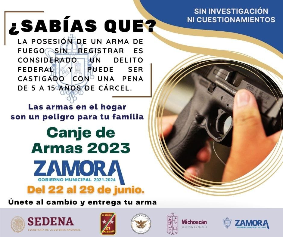 Zamora, Mich.- 21 de junio de 2023.- La Secretaría de la Defensa Nacional a través de la Comandancia de la 21/a. Zona Militar, invita a la ciudadanía a participar en la “Campaña de Canje de Armas de Fuego 2023”, la cual se llevará a cabo del 22 al 29 de junio, en este municipio de Zamora, implementada por el Ejército Mexicano en coordinación con las autoridades de los tres órdenes de gobierno.