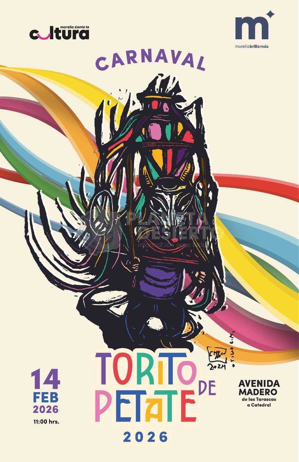Morelia, Michoacán; a 13 de febrero de 2026.- El presidente municipal, Alfonso Martínez Alcázar, a través de la Secretaría de Cultura (SeCultura) de Morelia, invita a las familias morelianas a disfrutar del Carnaval del Torito de Petate 2026, una celebración que fortalece las tradiciones, la convivencia y el orgullo por nuestra identidad.