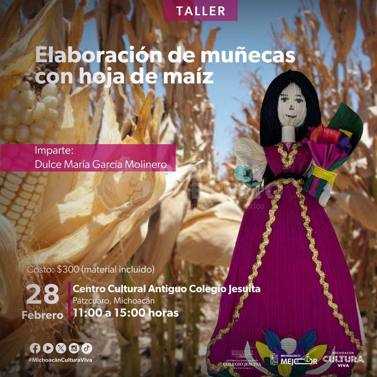 Pátzcuaro, Michoacán, 13 de febrero de 2026.-El Centro Cultural Antiguo Colegio Jesuita invita al taller: “Elaboración de muñecas con hojas de maíz”, una actividad que rescata saberes tradicionales y pone en valor el simbolismo del maíz en la cultura purépecha. La sesión será impartida por Dulce María García Molinero el próximo sábado 28 de febrero a las 11:00 horas, en el salón de usos múltiples 1 (planta baja), con una aportación de 300 pesos que incluye material.