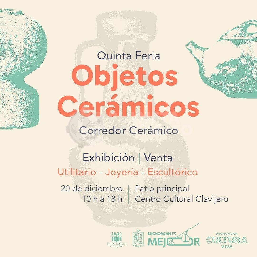 Morelia, Michoacán, 15 de diciembre de 2025.- La Secretaría de Cultura de Michoacán (Secum) invita a regalar arte y tradición en esta temporada decembrina con la quinta edición de la Feria de Objetos Cerámicos, que se realizará el sábado 20 de diciembre en el patio central del Centro Cultural Clavijero, de 10:00 a 18:00 horas.