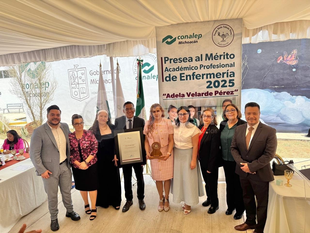 Morelia, Michoacán, 12 de mayo de 2025.- En la décimo segunda ceremonia de entrega de la Presea al Mérito Académico Profesional de Enfermería “Adela Velarde Pérez”, el Colegio de Educación Profesional Técnica del Estado de Michoacán (Conalep), otorgó su máximo galardón en el área de la salud a la destacada docente Laura González Villagómez.