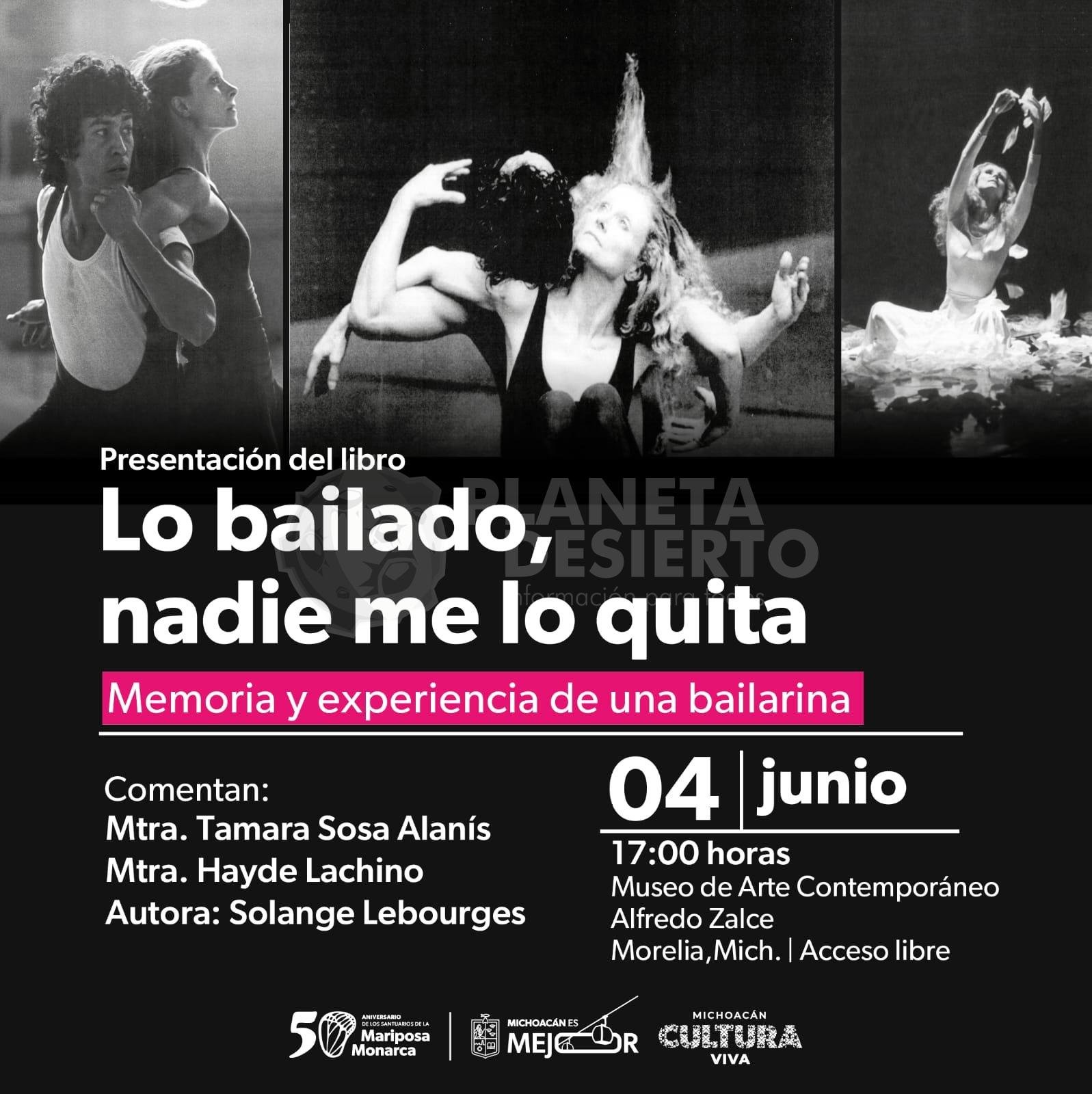 Morelia, Michoacán, 3 de junio de 2025.- La Secretaría de Cultura de Michoacán (Secum) invita al público a la presentación del libro “Lo bailado, nadie me lo quita”, de la maestra Solange Lebourges, este miércoles 4 de junio a las 17:00 horas en el Museo de Arte Contemporáneo Alfredo Zalce (MACAZ).