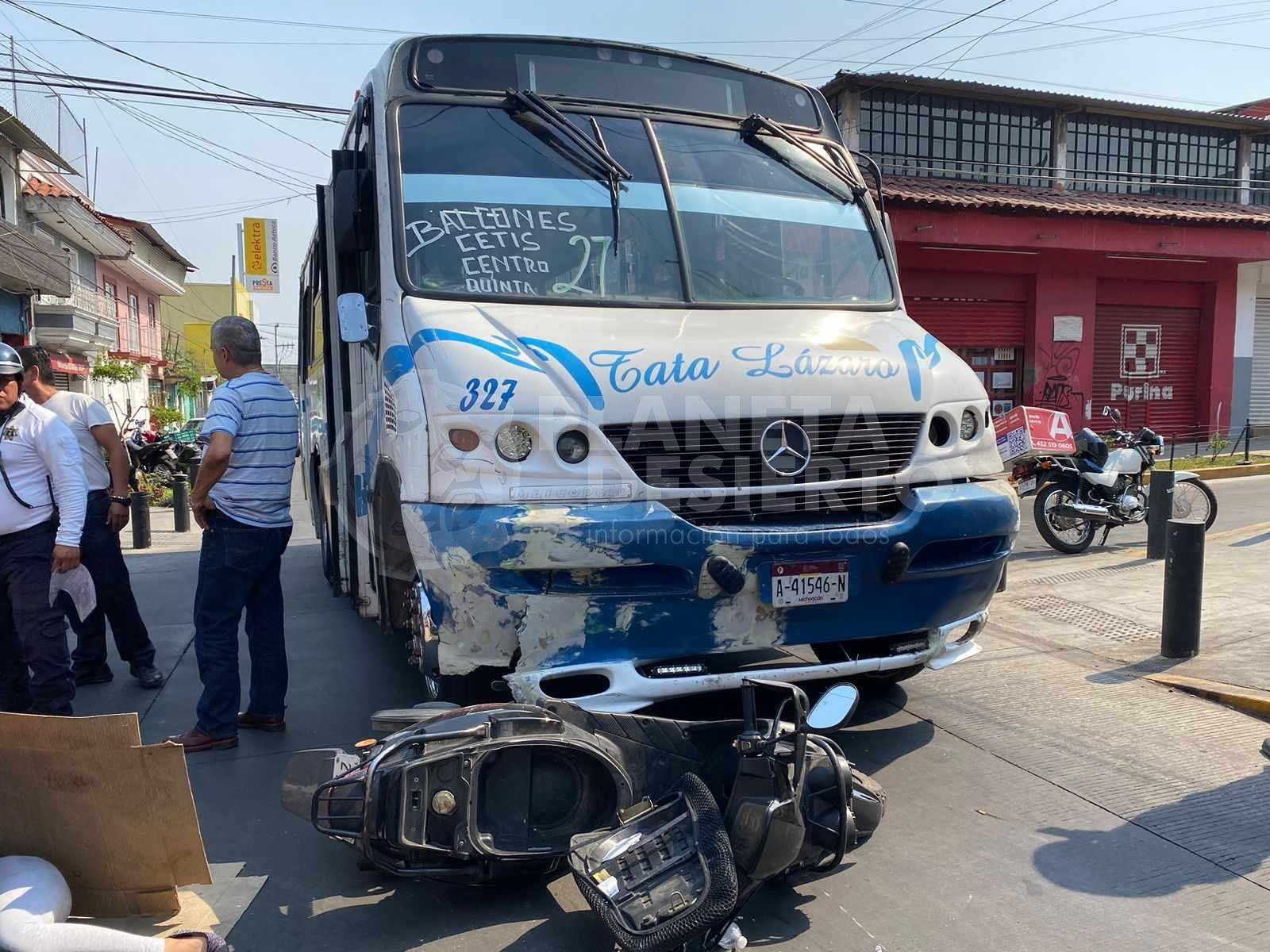 Uruapan, Mich.- 09 de mayo de 2024.- Una mujer y sus tres hijas menores de edad, que viajaban en una motocicleta resultaron heridas al ser impactadas por un camión del servicio urbano de la línea Tata Lázaro, en esta ciudad de Uruapan.