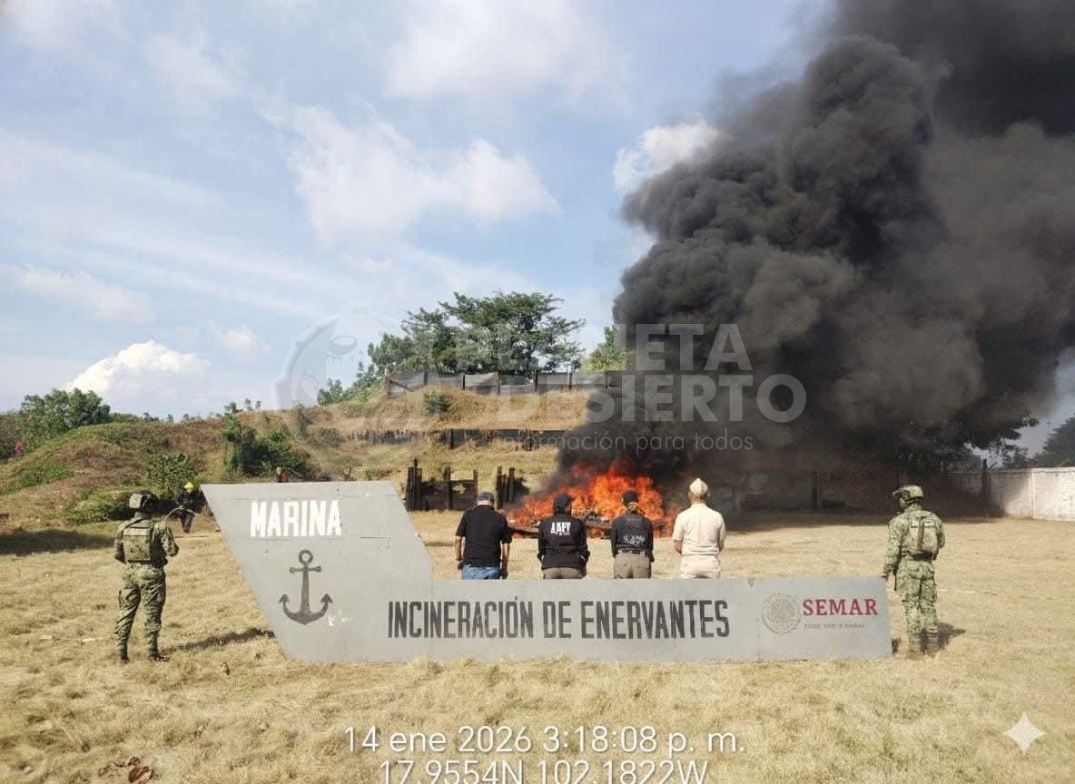 Lázaro Cárdenas, Michoacán, enero 15 de 2026.– La Secretaría de Marina a través de la Armada de México, por conducto de la Décima Sexto Zona Naval, informó que personal naval efectuó la incineración de 87 bultos que contenían aparentemente clorhidrato de cocaína, en inmediaciones de Lázaro Cárdenas Michoacán.