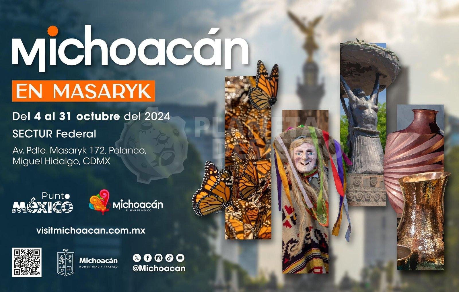 “Michoacán en Masaryk” es el nombre del evento con el que la Secretaría de Turismo del Estado, que encabeza Roberto Monroy García, difundirá todos los atractivos que turistas y visitantes podrán disfrutar en familia, con amigos o con la propia pareja, en el espacio denominado Punto México.